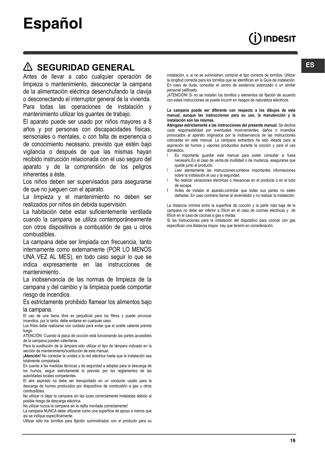 En caso de duda, consultar el centro de asistencia autorizado o un similar personal calificado. ¡ATENCIÓN! Si no se instalan los tornillos y elementos de fijación de acuerdo con estas instrucciones se puede incurrir en riesgos de naturaleza eléctricos. La campana puede ser diferente con respecto a los dibujos de este manual, aunque las instrucciones para su uso, la manutención y la instalación son las mismas. Aténgase estrictamente a las instrucciones del presente manual. Se declina cada responsabilidad por eventuales inconvenientes, daños o incendios provocados al aparato originados por la inobservancia de las instrucciones colocadas en este manual. La campana extractora ha sido ideada para la aspiración de humos y vapores producidos durante la cocción y para el uso doméstico. ! Es importante guardar este manual para poder consultar si fuera necesario.En el caso de venta,de inutilidad o de mudanza, asegurarse que quede junto al producto. ! Leer atentamente las instrucciones:contiene importantes informaciones sobre la instalación,el uso y la seguridad. ! No realizar variaciones electricas o mecanicas en el producto o en el tubo de escape. ! Antes de instalar el aparato,controlar que todas sus partes no estèn dañadas. En caso contrario llamar al revendedor y no realizar la instalaciòn. La distancia mínima entre la superficie de cocción y la parte más baja de la campana no debe ser inferior a 55cm en el caso de cocinas electricas y de 65cm en el caso de cocinas a gas o mixtas. Si las instrucciones para la instalación del dispositivo para cocinar con gas especifican una distancia mayor, hay que tenerlo en consideración.