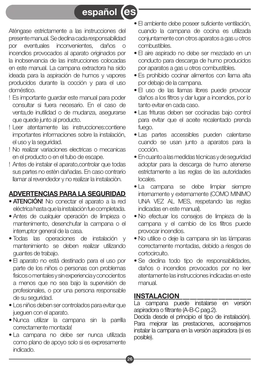 Aténgase estrictamente a las instrucciones del presente manual. Se declina cada responsabilidad por eventuales inconvenientes, daños o incendios provocados al aparato originados por la inobservancia de las instrucciones colocadas en este manual. La campana extractora ha sido ideada para la aspiración de humos y vapores producidos durante la cocción y para el uso doméstico.