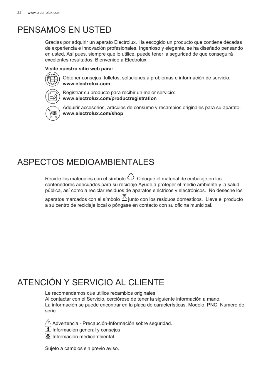 PENSAMOS EN USTED Gracias por adquirir un aparato Electrolux. Ha escogido un producto que contiene décadas de experiencia e innovación profesionales. Ingenioso y elegante, se ha diseñado pensando en usted. Así pues, siempre que lo utilice, puede tener la seguridad de que conseguirá excelentes resultados. Bienvenido a Electrolux. Visite nuestro sitio web para: Obtener consejos, folletos, soluciones a problemas e información de servicio: www.electrolux.com Registrar su producto para recibir un mejor servicio: www.electrolux.com/productregistration Adquirir accesorios, artículos de consumo y recambios originales para su aparato: www.electrolux.com/shop