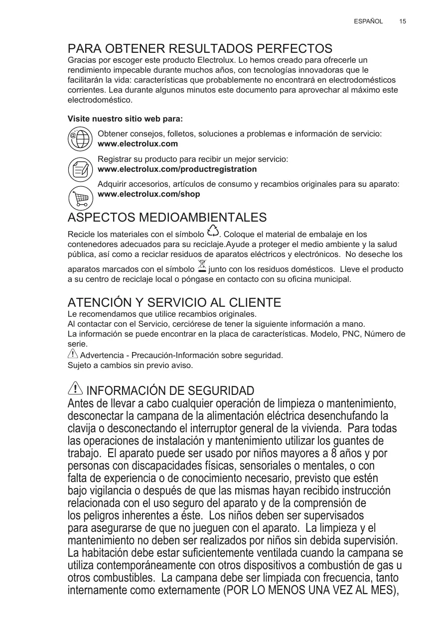 Visite nuestro sitio web para: Obtener consejos, folletos, soluciones a problemas e información de servicio: www.electrolux.com Registrar su producto para recibir un mejor servicio: www.electrolux.com/productregistration Adquirir accesorios, artículos de consumo y recambios originales para su aparato: www.electrolux.com/shop