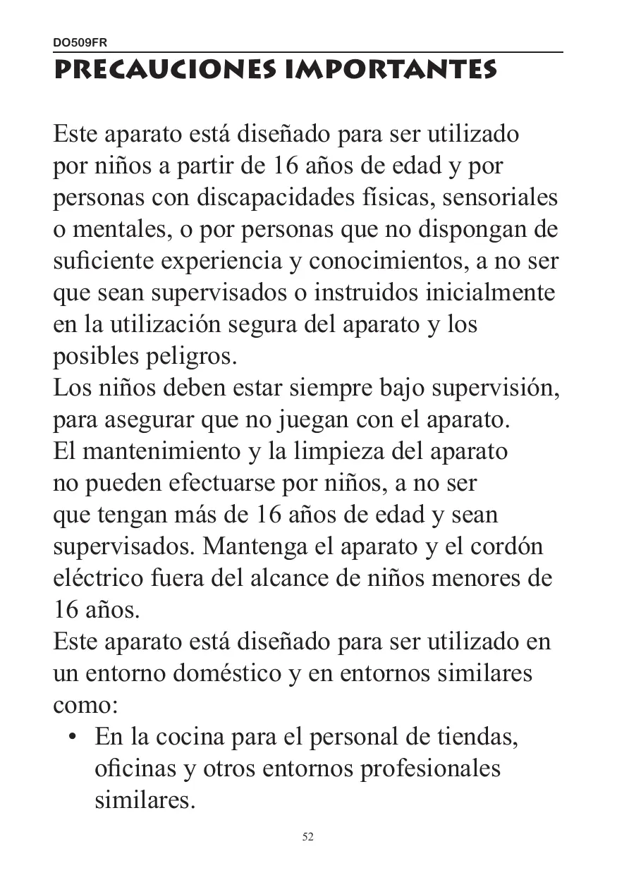 PRECAUCIONES IMPORTANTES Este aparato está diseñado para ser utilizado por niños a partir de 16 años de edad y por personas con discapacidades físicas, sensoriales o mentales, o por personas que no dispongan de suficiente experiencia y conocimientos, a no ser que sean supervisados o instruidos inicialmente en la utilización segura del aparato y los posibles peligros.
