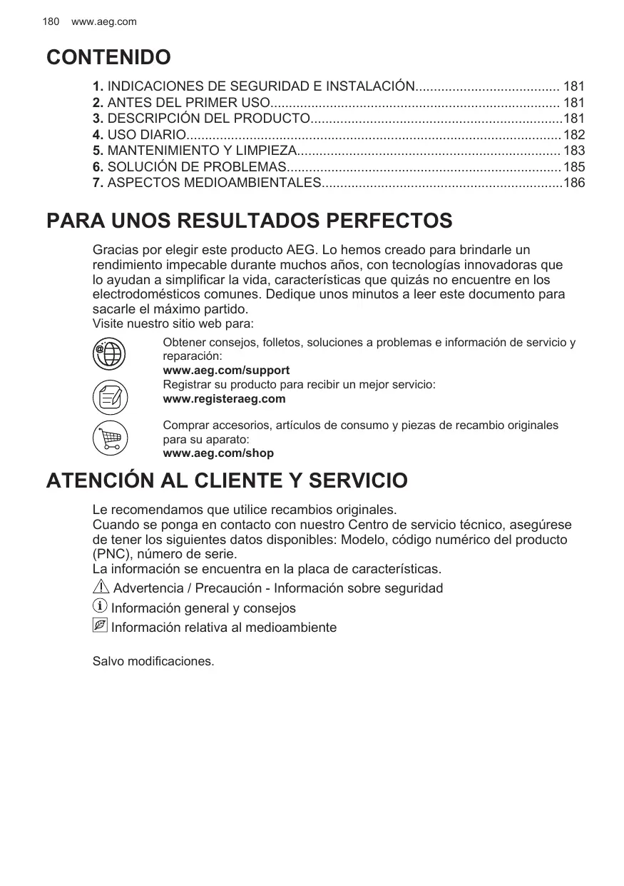 Registrar su producto para recibir un mejor servicio: www.registeraeg.com Comprar accesorios, artículos de consumo y piezas de recambio originales para su aparato: www.aeg.com/shop