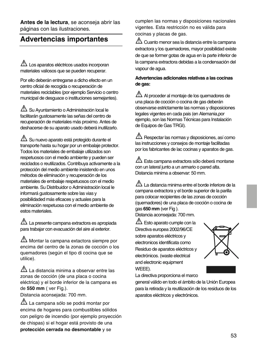 Cuanto menor sea la distancia entre la campana extractora y los quemadores, mayor posibilidad existe de que se former gotas de agua en la parte inferior de la campana extractora debidas a la condensación del vapour de agua. Advertencias adicionales relativas a las cocinas de gas: Al proceder al montaje de los quemadores de una placa de cocción o cocina de gas deberán observarse estrictamente las normas y disposiciones legales vigentes en cada pais (en Alemania,por ejemplo, son las Normas Técnicas para Instalación de Equipos de Gas TRGI).