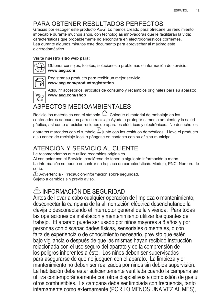 Lea durante algunos minutos este documento para aprovechar al máximo este electrodoméstico. Visite nuestro sitio web para: Obtener consejos, folletos, soluciones a problemas e información de servicio: www.aeg.com Registrar su producto para recibir un mejor servicio: www.aeg.com/productregistration Adquirir accesorios, artículos de consumo y recambios originales para su aparato: www.aeg.com/shop