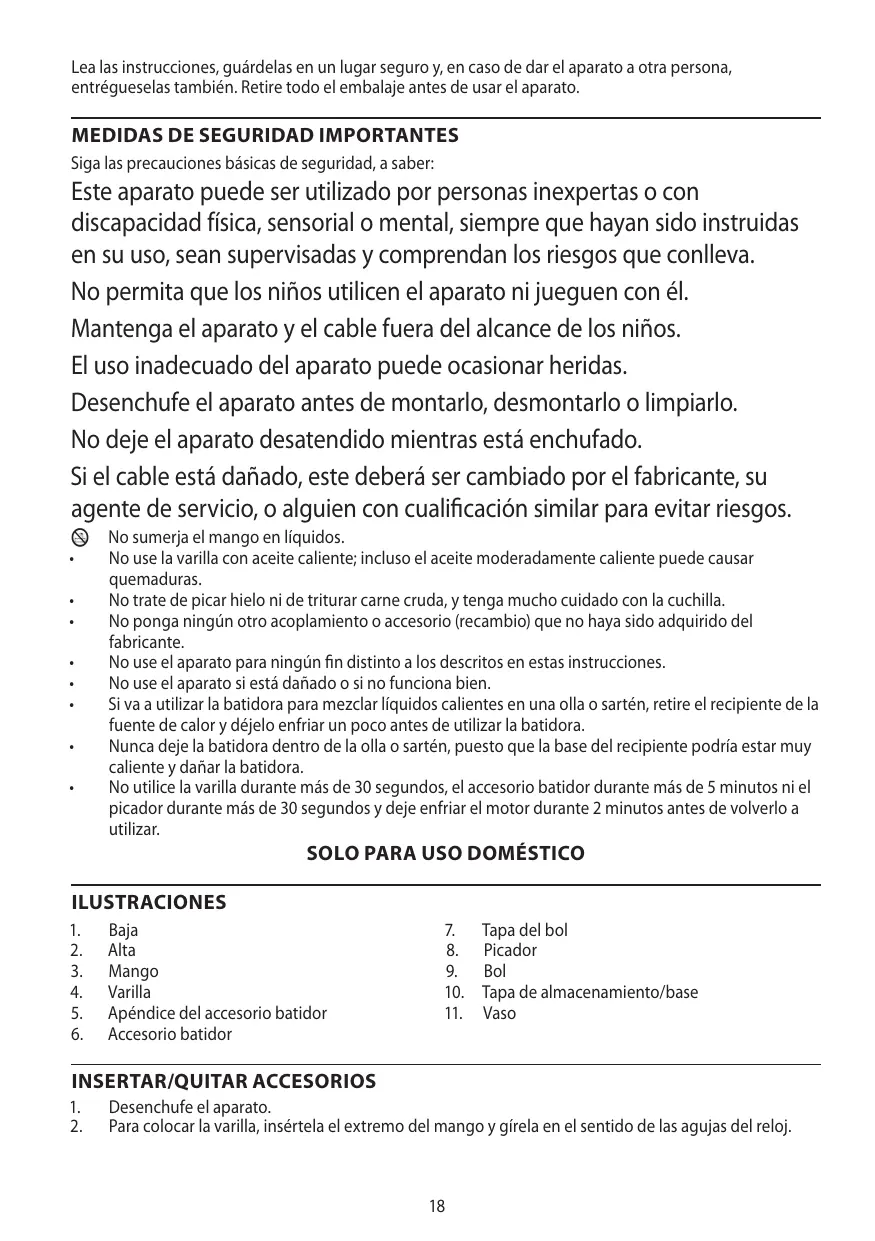 No use la varilla con aceite caliente; incluso el aceite moderadamente caliente puede causar quemaduras. No trate de picar hielo ni de triturar carne cruda, y tenga mucho cuidado con la cuchilla. No ponga ningún otro acoplamiento o accesorio (recambio) que no haya sido adquirido del fabricante. No use el aparato para ningún fin distinto a los descritos en estas instrucciones. No use el aparato si está dañado o si no funciona bien. Si va a utilizar la batidora para mezclar líquidos calientes en una olla o sartén, retire el recipiente de la fuente de calor y déjelo enfriar un poco antes de utilizar la batidora. Nunca deje la batidora dentro de la olla o sartén, puesto que la base del recipiente podría estar muy caliente y dañar la batidora. No utilice la varilla durante más de 30 segundos, el accesorio batidor durante más de 5 minutos ni el picador durante más de 30 segundos y deje enfriar el motor durante 2 minutos antes de volverlo a utilizar.