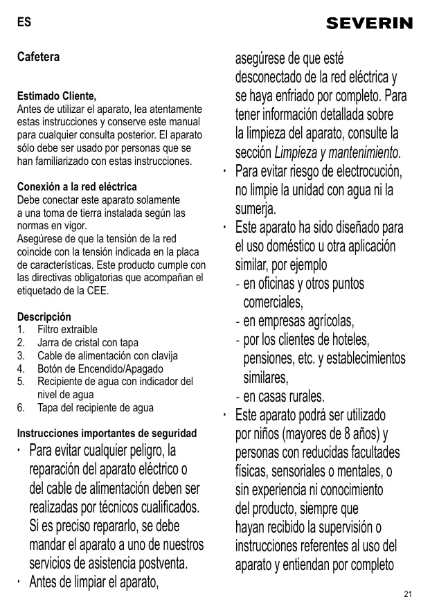 No deje el aparato sin vigilar durante su funcionamiento. Evite que la unidad o el cable de alimentación entren en contacto con superficies calientes o fuentes de calor. Precaución: la placa-térmica se calienta mucho durante el funcionamiento. Para evitar el peligro de emisión de agua caliente o vapor, apague siempre la cafetera y permita que se enfríe durante suficiente tiempo antes de abrirla o extraer cualquier accesorio o pieza. Apague siempre el aparato después de su utilización. Desenchufe el cable eléctrico de la toma de la pared - en caso de funcionamiento incorrecto, - durante la limpieza, - si no va a utilizar el aparato durante un largo periodo de tiempo. Cuando se desenchufa la clavija de la pared, nunca tirar del cable de alimentación. No permita que el cable eléctrico cuelgue suelto; se debe mantener el cable suficientemente alejado de las partes calientes del aparato. No se acepta responsabilidad alguna si hay averías a consecuencia del uso incorrecto del aparato o si estas instrucciones no han sido observadas debidamente.