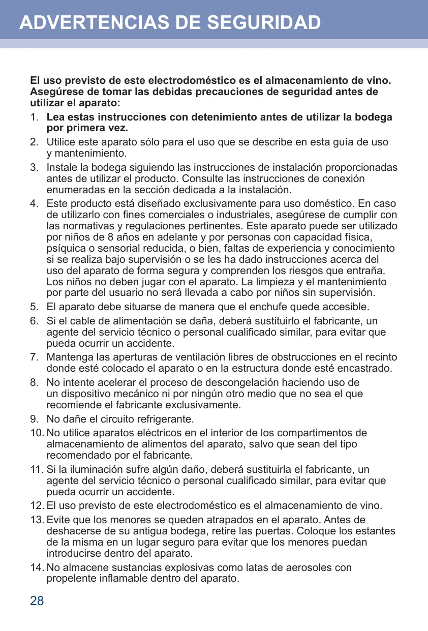 ADVERTENCIAS DE SEGURIDAD El uso previsto de este electrodoméstico es el almacenamiento de vino. Asegúrese de tomar las debidas precauciones de seguridad antes de utilizar el aparato: 1. Lea estas instrucciones con detenimiento antes de utilizar la bodega por primera vez. 2. Utilice este aparato sólo para el uso que se describe en esta guía de uso y mantenimiento. 3. Instale la bodega siguiendo las instrucciones de instalación proporcionadas antes de utilizar el producto. Consulte las instrucciones de conexión enumeradas en la sección dedicada a la instalación. 4. Este producto está diseñado exclusivamente para uso doméstico. En caso de utilizarlo con fines comerciales o industriales, asegúrese de cumplir con las normativas y regulaciones pertinentes. Este aparato puede ser utilizado por niños de 8 años en adelante y por personas con capacidad física, psíquica o sensorial reducida, o bien, faltas de experiencia y conocimiento si se realiza bajo supervisión o se les ha dado instrucciones acerca del uso del aparato de forma segura y comprenden los riesgos que entraña. Los niños no deben jugar con el aparato. La limpieza y el mantenimiento por parte del usuario no será llevada a cabo por niños sin supervisión. 5. El aparato debe situarse de manera que el enchufe quede accesible. 6. Si el cable de alimentación se daña, deberá sustituirlo el fabricante, un agente del servicio técnico o personal cualificado similar, para evitar que pueda ocurrir un accidente. 7. Mantenga las aperturas de ventilación libres de obstrucciones en el recinto donde esté colocado el aparato o en la estructura donde esté encastrado. 8. No intente acelerar el proceso de descongelación haciendo uso de un dispositivo mecánico ni por ningún otro medio que no sea el que recomiende el fabricante exclusivamente. 9. No dañe el circuito refrigerante. 10. No utilice aparatos eléctricos en el interior de los compartimentos de almacenamiento de alimentos del aparato, salvo que sean del tipo recomendado por el fabricante. 11. Si la iluminación sufre algún daño, deberá sustituirla el fabricante, un agente del servicio técnico o personal cualificado similar, para evitar que pueda ocurrir un accidente. 12. El uso previsto de este electrodoméstico es el almacenamiento de vino. 13. Evite que los menores se queden atrapados en el aparato. Antes de deshacerse de su antigua bodega, retire las puertas. Coloque los estantes de la misma en un lugar seguro para evitar que los menores puedan introducirse dentro del aparato. 14. No almacene sustancias explosivas como latas de aerosoles con propelente inflamable dentro del aparato.