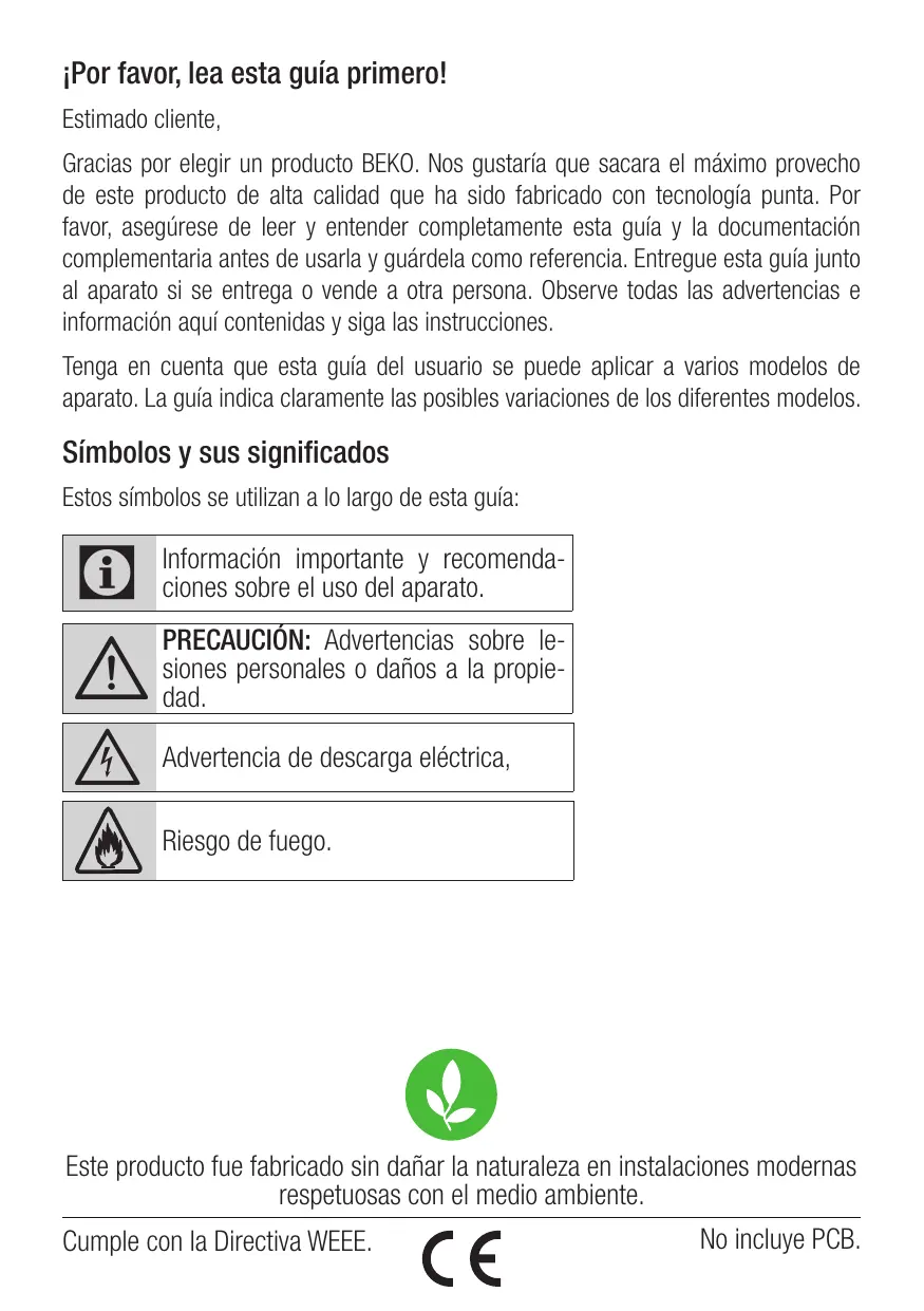 ¡Por favor, lea esta guía primero! Estimado cliente, Gracias por elegir un producto BEKO. Nos gustaría que sacara el máximo provecho de este producto de alta calidad que ha sido fabricado con tecnología punta. Por favor, asegúrese de leer y entender completamente esta guía y la documentación complementaria antes de usarla y guárdela como referencia. Entregue esta guía junto al aparato si se entrega o vende a otra persona. Observe todas las advertencias e información aquí contenidas y siga las instrucciones. Tenga en cuenta que esta guía del usuario se puede aplicar a varios modelos de aparato. La guía indica claramente las posibles variaciones de los diferentes modelos.