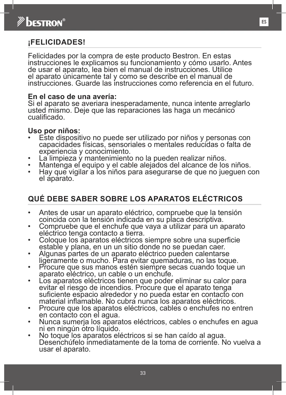 Felicidades por la compra de este producto Bestron. En estas instrucciones le explicamos su funcionamiento y cómo usarlo. Antes de usar el aparato, lea bien el manual de instrucciones. Utilice el aparato únicamente tal y como se describe en el manual de instrucciones. Guarde las instrucciones como referencia en el futuro. En el caso de una avería: Si el aparato se averiara inesperadamente, nunca intente arreglarlo usted mismo. Deje que las reparaciones las haga un mecánico cualificado. Uso por niños: • Este dispositivo no puede ser utilizado por niños y personas con capacidades físicas, sensoriales o mentales reducidas o falta de experiencia y conocimiento. • La limpieza y mantenimiento no la pueden realizar niños. • Mantenga el equipo y el cable alejados del alcance de los niños. • Hay que vigilar a los niños para asegurarse de que no jueguen con el aparato. QUÉ DEBE SABER SOBRE LOS APARATOS ELÉCTRICOS • • • • • • • • •