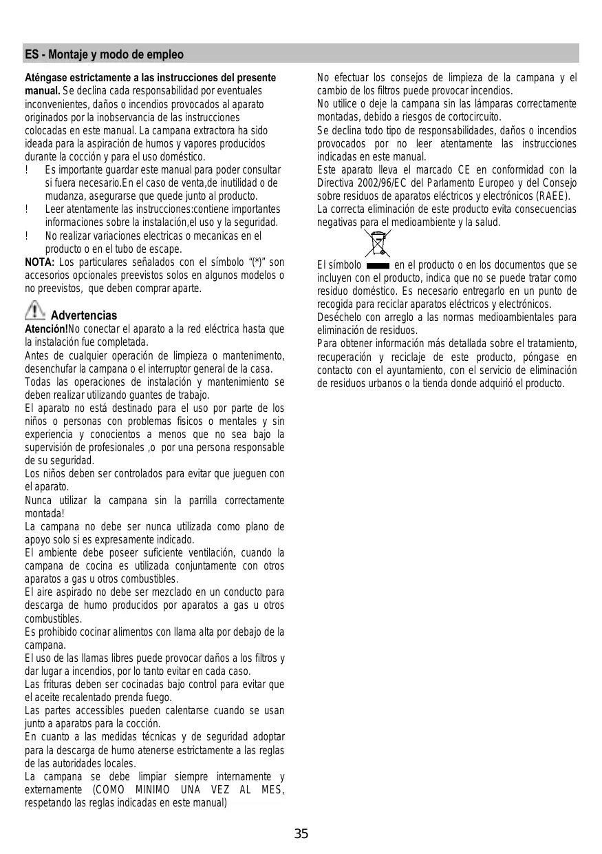 ES - Montaje y modo de empleo No efectuar los consejos de limpieza de la campana y el cambio de los filtros puede provocar incendios. No utilice o deje la campana sin las lámparas correctamente montadas, debido a riesgos de cortocircuito. Se declina todo tipo de responsabilidades, daños o incendios provocados por no leer atentamente las instrucciones indicadas en este manual. Este aparato lleva el marcado CE en conformidad con la Directiva 2002/96/EC del Parlamento Europeo y del Consejo sobre residuos de aparatos eléctricos y electrónicos (RAEE). La correcta eliminación de este producto evita consecuencias negativas para el medioambiente y la salud.