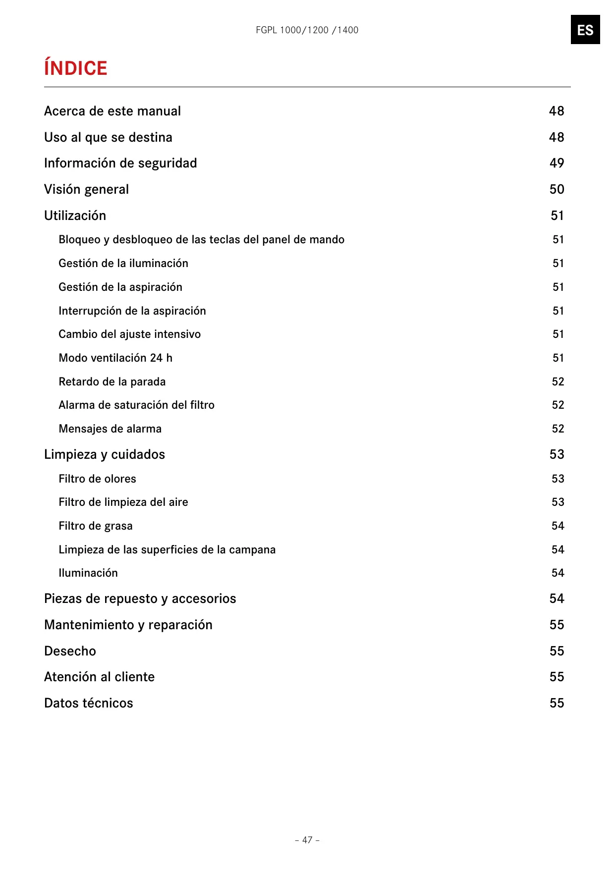 100 horas de funcionamiento. „„Visualizador: muestra «EF» que indica la necesidad de lavar los filtros antigrasa y cambiar o lavar los filtros antiolores (según su tipo), cada 200 horas de funcionamiento. „„Estas indicaciones «FG y EF» no son visibles con el motor y la iluminación apagados.