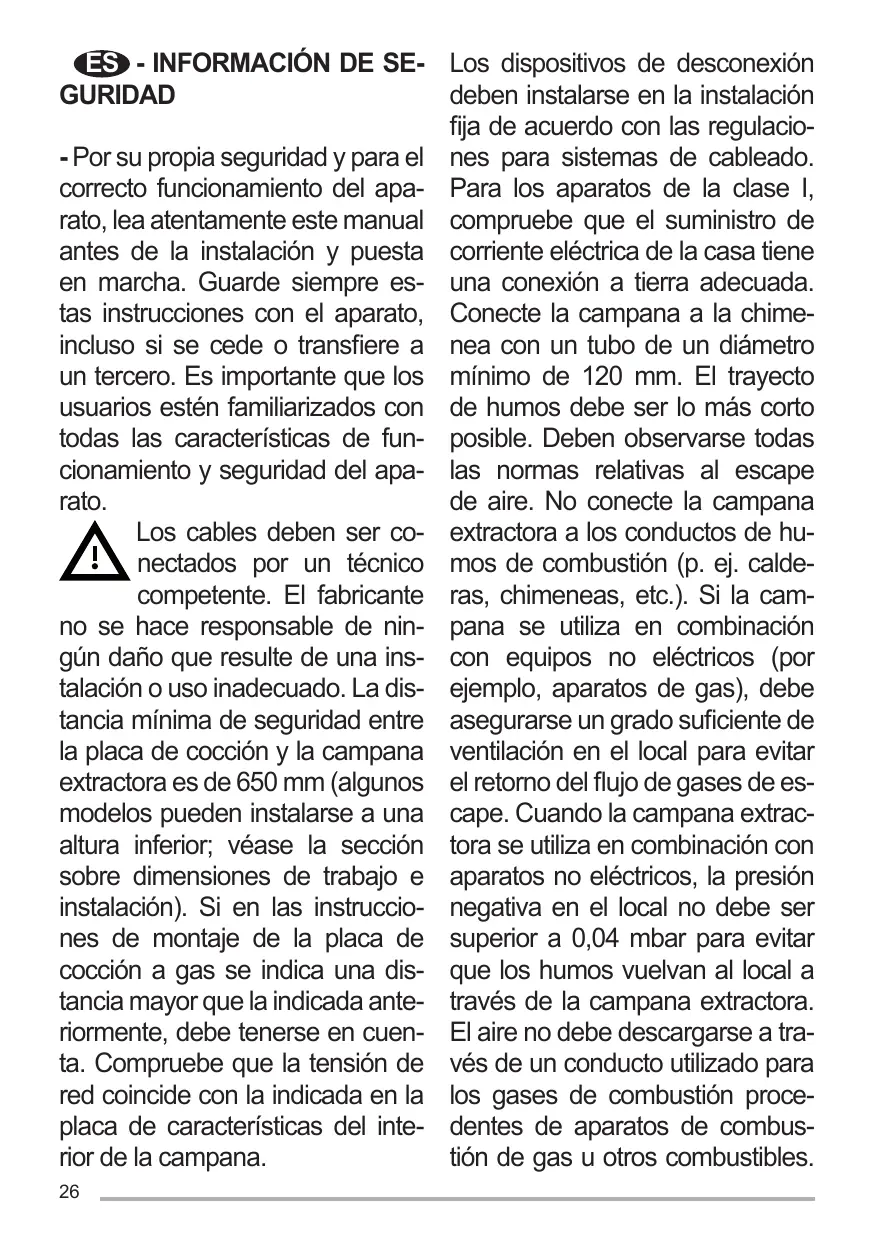 ES - INFORMACIÓN DE SE- Los dispositivos de desconexión deben instalarse en la instalación GURIDAD fija de acuerdo con las regulacio- Por su propia seguridad y para el nes para sistemas de cableado. correcto funcionamiento del apa- Para los aparatos de la clase I, rato, lea atentamente este manual compruebe que el suministro de antes de la instalación y puesta corriente eléctrica de la casa tiene en marcha. Guarde siempre es- una conexión a tierra adecuada. tas instrucciones con el aparato, Conecte la campana a la chimeincluso si se cede o transfiere a nea con un tubo de un diámetro un tercero. Es importante que los mínimo de 120 mm. El trayecto usuarios estén familiarizados con de humos debe ser lo más corto todas las características de fun- posible. Deben observarse todas cionamiento y seguridad del apa- las normas relativas al escape rato. de aire. No conecte la campana Los cables deben ser co- extractora a los conductos de hunectados por un técnico mos de combustión (p. ej. caldecompetente. El fabricante ras, chimeneas, etc.). Si la camno se hace responsable de nin- pana se utiliza en combinación gún daño que resulte de una ins- con equipos no eléctricos (por talación o uso inadecuado. La dis- ejemplo, aparatos de gas), debe tancia mínima de seguridad entre asegurarse un grado suficiente de la placa de cocción y la campana ventilación en el local para evitar extractora es de 650 mm (algunos el retorno del flujo de gases de esmodelos pueden instalarse a una cape. Cuando la campana extracaltura inferior; véase la sección tora se utiliza en combinación con sobre dimensiones de trabajo e aparatos no eléctricos, la presión instalación). Si en las instruccio- negativa en el local no debe ser nes de montaje de la placa de superior a 0,04 mbar para evitar cocción a gas se indica una dis- que los humos vuelvan al local a tancia mayor que la indicada ante- través de la campana extractora. riormente, debe tenerse en cuen- El aire no debe descargarse a trata. Compruebe que la tensión de vés de un conducto utilizado para red coincide con la indicada en la los gases de combustión proceplaca de características del inte- dentes de aparatos de combusrior de la campana. tión de gas u otros combustibles. 26