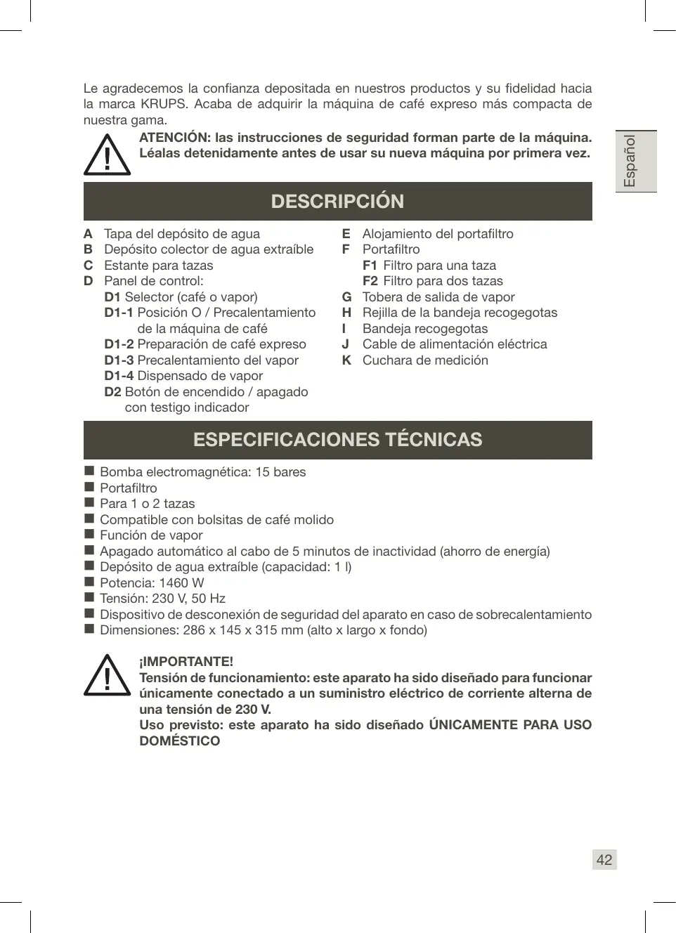 Le agradecemos la confianza depositada en nuestros productos y su fidelidad hacia la marca KRUPS. Acaba de adquirir la máquina de café expreso más compacta de nuestra gama. ATENCIÓN: las instrucciones de seguridad forman parte de la máquina. Léalas detenidamente antes de usar su nueva máquina por primera vez.