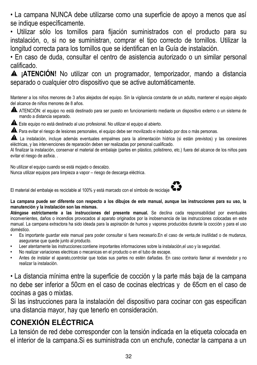 • Utilizar sólo los tornillos para fijación suministrados con el producto para su instalación, o, si no se suministran, comprar el tipo correcto de tornillos. Utilizar la longitud correcta para los tornillos que se identifican en la Guía de instalación. • En caso de duda, consultar el centro de asistencia autorizado o un similar personal calificado. ¡ATENCIÓN! No utilizar con un programador, temporizador, mando a distancia separado o cualquier otro dispositivo que se active automáticamente. Mantener a los niños menores de 3 años alejados del equipo. Sin la vigilancia constante de un adulto, mantener el equipo alejado del alcance de niños menores de 8 años. ATENCIÓN: el equipo no está destinado para ser puesto en funcionamiento mediante un dispositivo externo o un sistema de mando a distancia separado. Este equipo no está destinado al uso profesional. No utilizar el equipo al abierto. Para evitar el riesgo de lesiones personales, el equipo debe ser movilizado e instalado por dos o más personas. La instalación, incluye además eventuales empalmes para la alimentación hídrica (si están previstos) y las conexiones eléctricas, y las intervenciones de reparación deben ser realizadas por personal cualificado. Al finalizar la instalación, conservar el material de embalaje (partes en plástico, polistireno, etc.) fuera del alcance de los niños para evitar el riesgo de asfixia. . No utilizar el equipo cuando se está mojado o descalzo. Nunca utilizar equipos para limpieza a vapor – riesgo de descarga eléctrica. El material del embalaje es reciclable al 100% y está marcado con el símbolo de reciclaje La campana puede ser diferente con respecto a los dibujos de este manual, aunque las instrucciones para su uso, la manutención y la instalación son las mismas. Aténgase estrictamente a las instrucciones del presente manual. Se declina cada responsabilidad por eventuales inconvenientes, daños o incendios provocados al aparato originados por la inobservancia de las instrucciones colocadas en este manual. La campana extractora ha sido ideada para la aspiración de humos y vapores producidos durante la cocción y para el uso doméstico. • Es importante guardar este manual para poder consultar si fuera necesario.En el caso de venta,de inutilidad o de mudanza, asegurarse que quede junto al producto. • Leer atentamente las instrucciones:contiene importantes informaciones sobre la instalación,el uso y la seguridad. • No realizar variaciones electricas o mecanicas en el producto o en el tubo de escape. • Antes de instalar el aparato,controlar que todas sus partes no estèn dañadas. En caso contrario llamar al revendedor y no realizar la instalaciòn.
