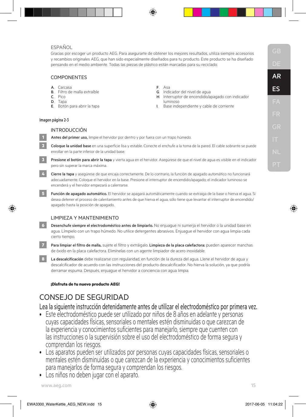 • Este electrodoméstico puede ser utilizado por niños de 8 años en adelante y personas cuyas capacidades físicas, sensoriales o mentales estén disminuidas o que carezcan de la experiencia y conocimientos suficientes para manejarlo, siempre que cuenten con las instrucciones o la supervisión sobre el uso del electrodoméstico de forma segura y comprendan los riesgos. • Los aparatos pueden ser utilizados por personas cuyas capacidades físicas, sensoriales o mentales estén disminuidas o que carezcan de la experiencia y conocimientos suficientes para manejarlos de forma segura y comprendan los riesgos. • Los niños no deben jugar con el aparato. www.aeg.com EWA3300_WaterKettle_AEG_NEW.indd 15