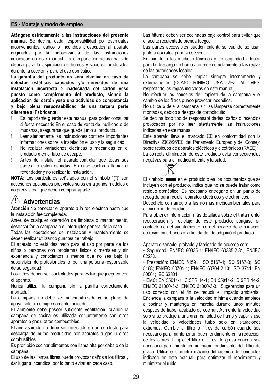 ES - Montaje y modo de empleo Las frituras deben ser cocinadas bajo control para evitar que el aceite recalentado prenda fuego. Las partes accessibles pueden calentarse cuando se usan junto a aparatos para la cocción. En cuanto a las medidas técnicas y de seguridad adoptar para la descarga de humo atenerse estrictamente a las reglas de las autoridades locales. La campana se debe limpiar siempre internamente y externamente (COMO MINIMO UNA VEZ AL MES, respetando las reglas indicadas en este manual) No efectuar los consejos de limpieza de la campana y el cambio de los filtros puede provocar incendios. No utilice o deje la campana sin las lámparas correctamente montadas, debido a riesgos de cortocircuito. Se declina todo tipo de responsabilidades, daños o incendios provocados por no leer atentamente las instrucciones indicadas en este manual. Este aparato lleva el marcado CE en conformidad con la Directiva 2002/96/EC del Parlamento Europeo y del Consejo sobre residuos de aparatos eléctricos y electrónicos (RAEE). La correcta eliminación de este producto evita consecuencias negativas para el medioambiente y la salud.