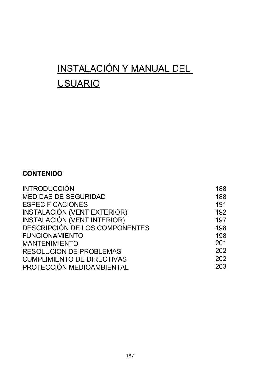 INSTALACIÓN Y MANUAL DEL USUARIO CONTENIDO INTRODUCCIÓN MEDIDAS DE SEGURIDAD ESPECIFICACIONES INSTALACIÓN (VENT EXTERIOR)