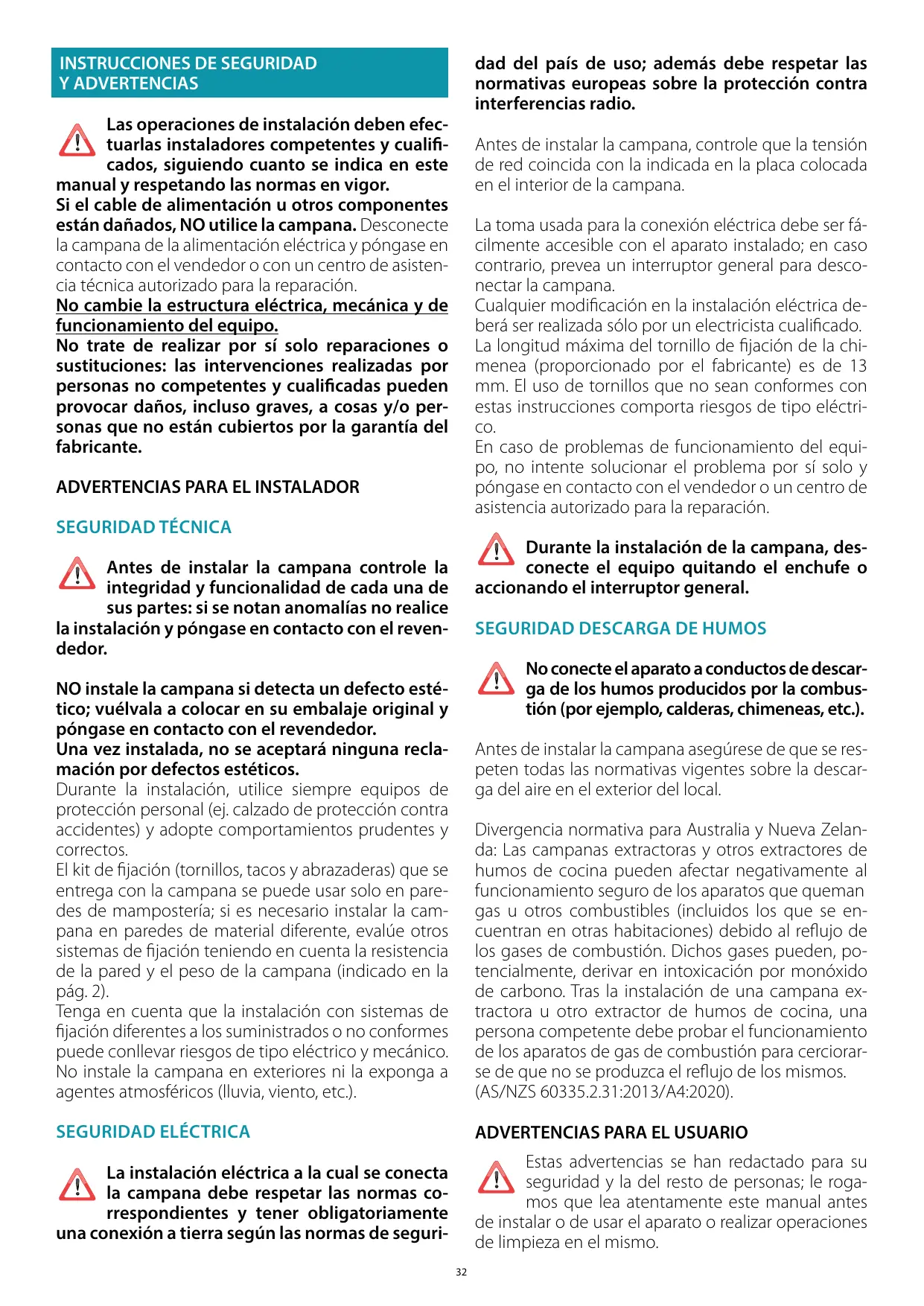Una vez instalada, no se aceptará ninguna reclamación por defectos estéticos. Durante la instalación, utilice siempre equipos de protección personal (ej. calzado de protección contra accidentes) y adopte comportamientos prudentes y correctos. El kit de fijación (tornillos, tacos y abrazaderas) que se entrega con la campana se puede usar solo en paredes de mampostería; si es necesario instalar la campana en paredes de material diferente, evalúe otros sistemas de fijación teniendo en cuenta la resistencia de la pared y el peso de la campana (indicado en la pág. 2). Tenga en cuenta que la instalación con sistemas de fijación diferentes a los suministrados o no conformes puede conllevar riesgos de tipo eléctrico y mecánico. No instale la campana en exteriores ni la exponga a agentes atmosféricos (lluvia, viento, etc.).