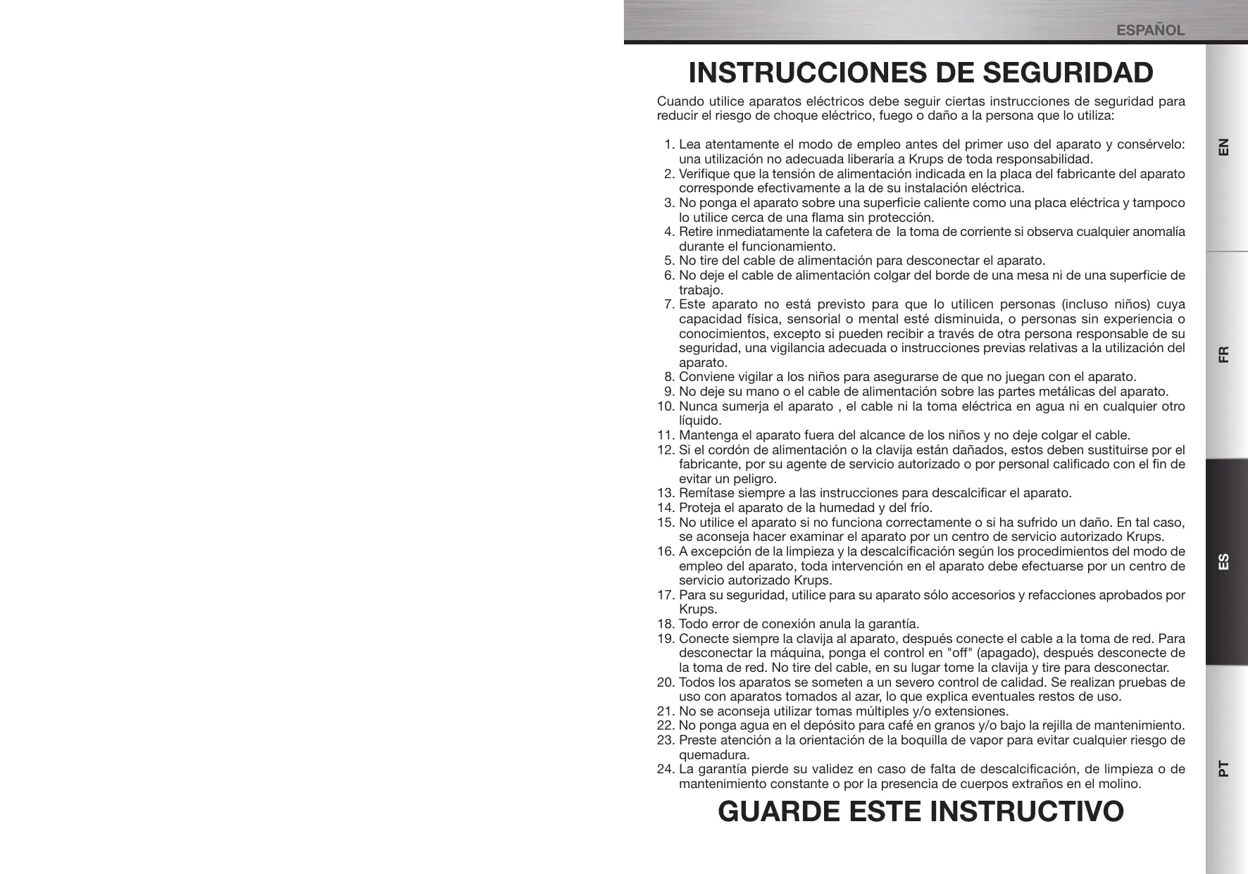 1. Lea atentamente el modo de empleo antes del primer uso del aparato y consérvelo: una utilización no adecuada liberaría a Krups de toda responsabilidad.