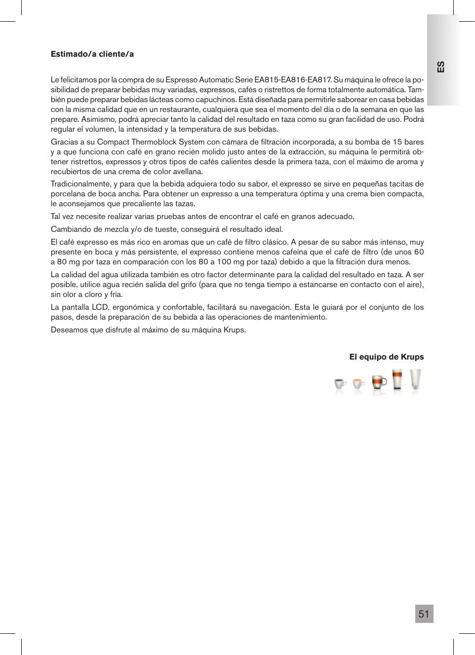 Le felicitamos por la compra de su Espresso Automatic Serie EA815-EA816-EA817. Su máquina le ofrece la posibilidad de preparar bebidas muy variadas, expressos, cafés o ristrettos de forma totalmente automática. También puede preparar bebidas lácteas como capuchinos. Está diseñada para permitirle saborear en casa bebidas con la misma calidad que en un restaurante, cualquiera que sea el momento del día o de la semana en que las prepare. Asimismo, podrá apreciar tanto la calidad del resultado en taza como su gran facilidad de uso. Podrá regular el volumen, la intensidad y la temperatura de sus bebidas. Gracias a su Compact Thermoblock System con cámara de filtración incorporada, a su bomba de 15 bares y a que funciona con café en grano recién molido justo antes de la extracción, su máquina le permitirá obtener ristrettos, expressos y otros tipos de cafés calientes desde la primera taza, con el máximo de aroma y recubiertos de una crema de color avellana. Tradicionalmente, y para que la bebida adquiera todo su sabor, el expresso se sirve en pequeñas tacitas de porcelana de boca ancha. Para obtener un expresso a una temperatura óptima y una crema bien compacta, le aconsejamos que precaliente las tazas. Tal vez necesite realizar varias pruebas antes de encontrar el café en granos adecuado. Cambiando de mezcla y/o de tueste, conseguirá el resultado ideal. El café expresso es más rico en aromas que un café de filtro clásico. A pesar de su sabor más intenso, muy presente en boca y más persistente, el expresso contiene menos cafeína que el café de filtro (de unos 60 a 80 mg por taza en comparación con los 80 a 100 mg por taza) debido a que la filtración dura menos. La calidad del agua utilizada también es otro factor determinante para la calidad del resultado en taza. A ser posible, utilice agua recién salida del grifo (para que no tenga tiempo a estancarse en contacto con el aire), sin olor a cloro y fría. La pantalla LCD, ergonómica y confortable, facilitará su navegación. Esta le guiará por el conjunto de los pasos, desde la preparación de su bebida a las operaciones de mantenimiento. Deseamos que disfrute al máximo de su máquina Krups. El equipo de Krups
