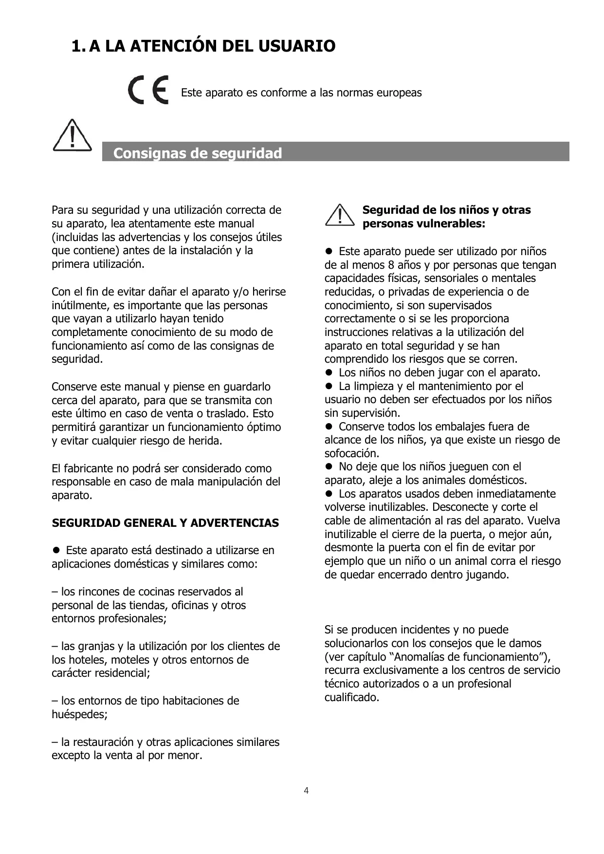 1. A LA ATENCIÓN DEL USUARIO Este aparato es conforme a las normas europeas