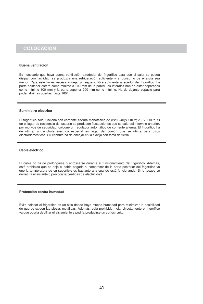 Es necesario que haya buena ventilación alrededor del frigorífico para que el calor se pueda disipar con facilidad, se produzca una refrigeración suficiente y el consumo de energía sea menor. Para este fin es necesario dejar un espacio libre suficiente alrededor del frigorífico. La parte posterior estará como mínimo a 100 mm de la pared, los laterales han de estar separados como mínimo 100 mm y la parte superior 200 mm como mínimo. Ha de dejarse espacio para poder abrir las puertas hasta 160º.