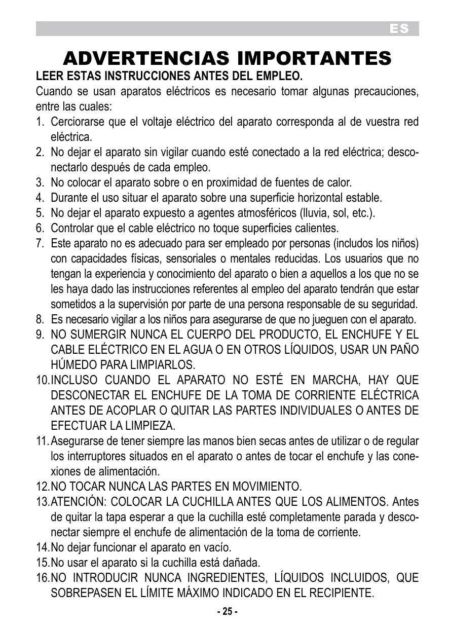 LEER ESTAS INSTRUCCIONES ANTES DEL EMPLEO. Cuando se usan aparatos eléctricos es necesario tomar algunas precauciones, entre las cuales: 1. Cerciorarse que el voltaje eléctrico del aparato corresponda al de vuestra red eléctrica. 2. No dejar el aparato sin vigilar cuando esté conectado a la red eléctrica; desconectarlo después de cada empleo. 3. No colocar el aparato sobre o en proximidad de fuentes de calor. 4. Durante el uso situar el aparato sobre una superficie horizontal estable. 5. No dejar el aparato expuesto a agentes atmosféricos (lluvia, sol, etc.). 6. Controlar que el cable eléctrico no toque superficies calientes. 7. Este aparato no es adecuado para ser empleado por personas (includos los niños) con capacidades físicas, sensoriales o mentales reducidas. Los usuarios que no tengan la experiencia y conocimiento del aparato o bien a aquellos a los que no se les haya dado las instrucciones referentes al empleo del aparato tendrán que estar sometidos a la supervisión por parte de una persona responsable de su seguridad. 8. Es necesario vigilar a los niños para asegurarse de que no jueguen con el aparato. 9. NO SUMERGIR NUNCA EL CUERPO DEL PRODUCTO, EL ENCHUFE Y EL CABLE ELÉCTRICO EN EL AGUA O EN OTROS LÍQUIDOS, USAR UN PAÑO HÚMEDO PARA LIMPIARLOS. 10. INCLUSO CUANDO EL APARATO NO ESTÉ EN MARCHA, HAY QUE DESCONECTAR EL ENCHUFE DE LA TOMA DE CORRIENTE ELÉCTRICA ANTES DE ACOPLAR O QUITAR LAS PARTES INDIVIDUALES O ANTES DE EFECTUAR LA LIMPIEZA. 11. Asegurarse de tener siempre las manos bien secas antes de utilizar o de regular los interruptores situados en el aparato o antes de tocar el enchufe y las conexiones de alimentación. 12. NO TOCAR NUNCA LAS PARTES EN MOVIMIENTO. 13. ATENCIÓN: COLOCAR LA CUCHILLA ANTES QUE LOS ALIMENTOS. Antes de quitar la tapa esperar a que la cuchilla esté completamente parada y desconectar siempre el enchufe de alimentación de la toma de corriente. 14. No dejar funcionar el aparato en vacío. 15. No usar el aparato si la cuchilla está dañada. 16. NO INTRODUCIR NUNCA INGREDIENTES, LÍQUIDOS INCLUIDOS, QUE SOBREPASEN EL LÍMITE MÁXIMO INDICADO EN EL RECIPIENTE. - 25 -