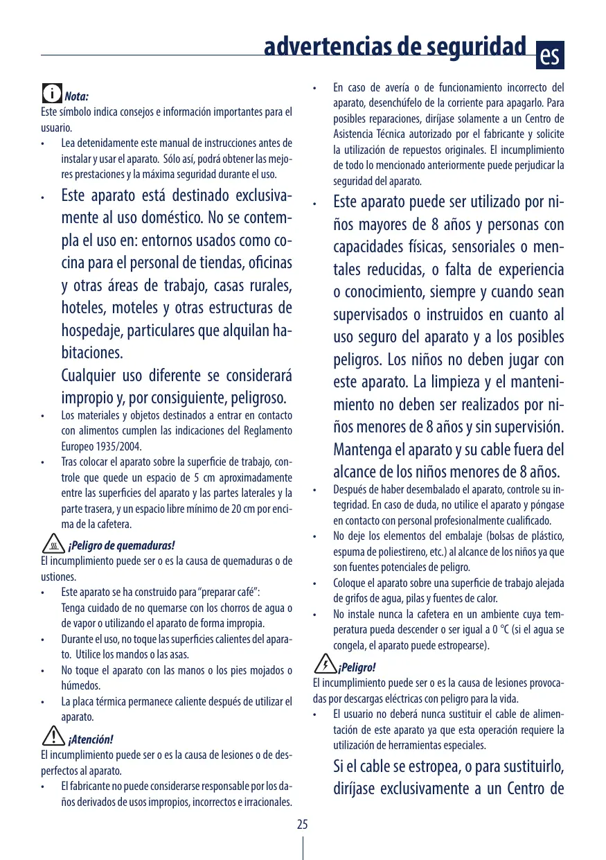 El incumplimiento puede ser o es la causa de quemaduras o de ustiones. • Este aparato se ha construido para “preparar café”: Tenga cuidado de no quemarse con los chorros de agua o de vapor o utilizando el aparato de forma impropia. • Durante el uso, no toque las superficies calientes del aparato. Utilice los mandos o las asas. • No toque el aparato con las manos o los pies mojados o húmedos. • La placa térmica permanece caliente después de utilizar el aparato.