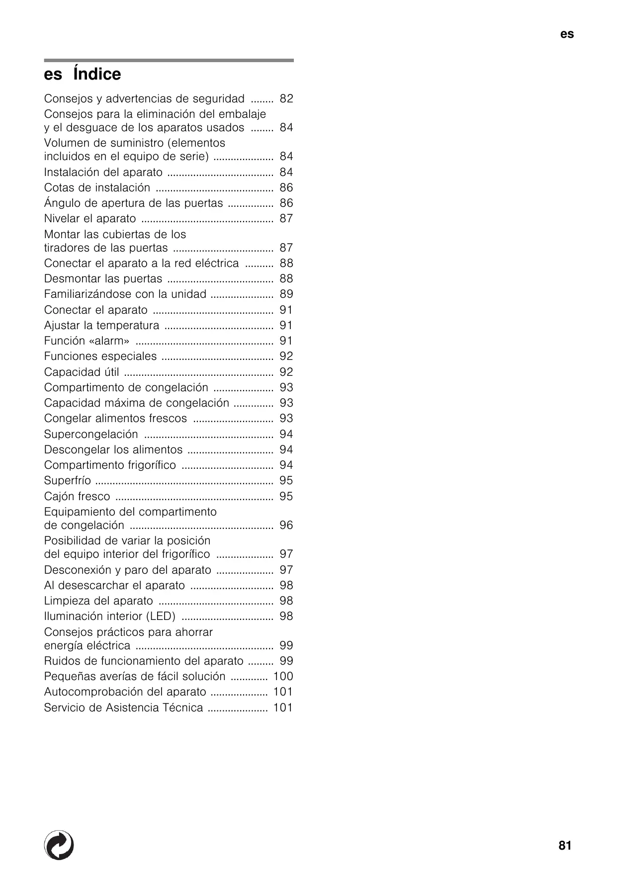 - Consejos para la eliminación del embalaje y el desguace de los aparatos usados p. 84