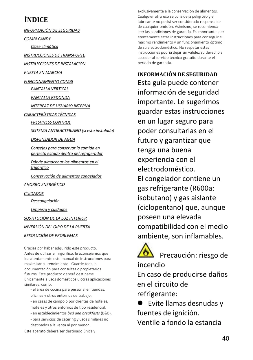 ÍNDICE INFORMACIÓN DE SEGURIDAD COMBI CANDY Clase climática INSTRUCCIONES DE TRANSPORTE INSTRUCCIONES DE INSTALACIÓN