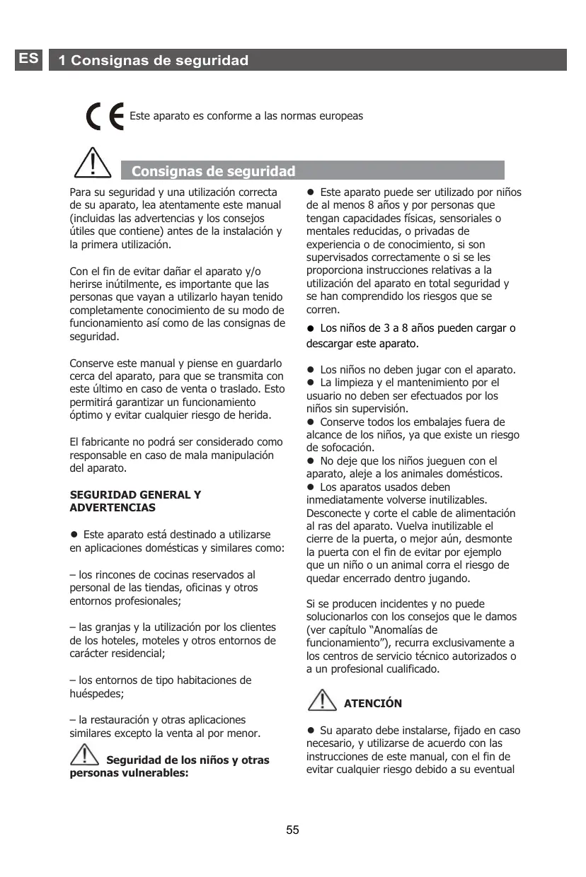 Consignas de seguridad z Este aparato puede ser utilizado por niños de al menos 8 años y por personas que tengan capacidades físicas, sensoriales o mentales reducidas, o privadas de experiencia o de conocimiento, si son supervisados correctamente o si se les proporciona instrucciones relativas a la utilización del aparato en total seguridad y se han comprendido los riesgos que se corren.