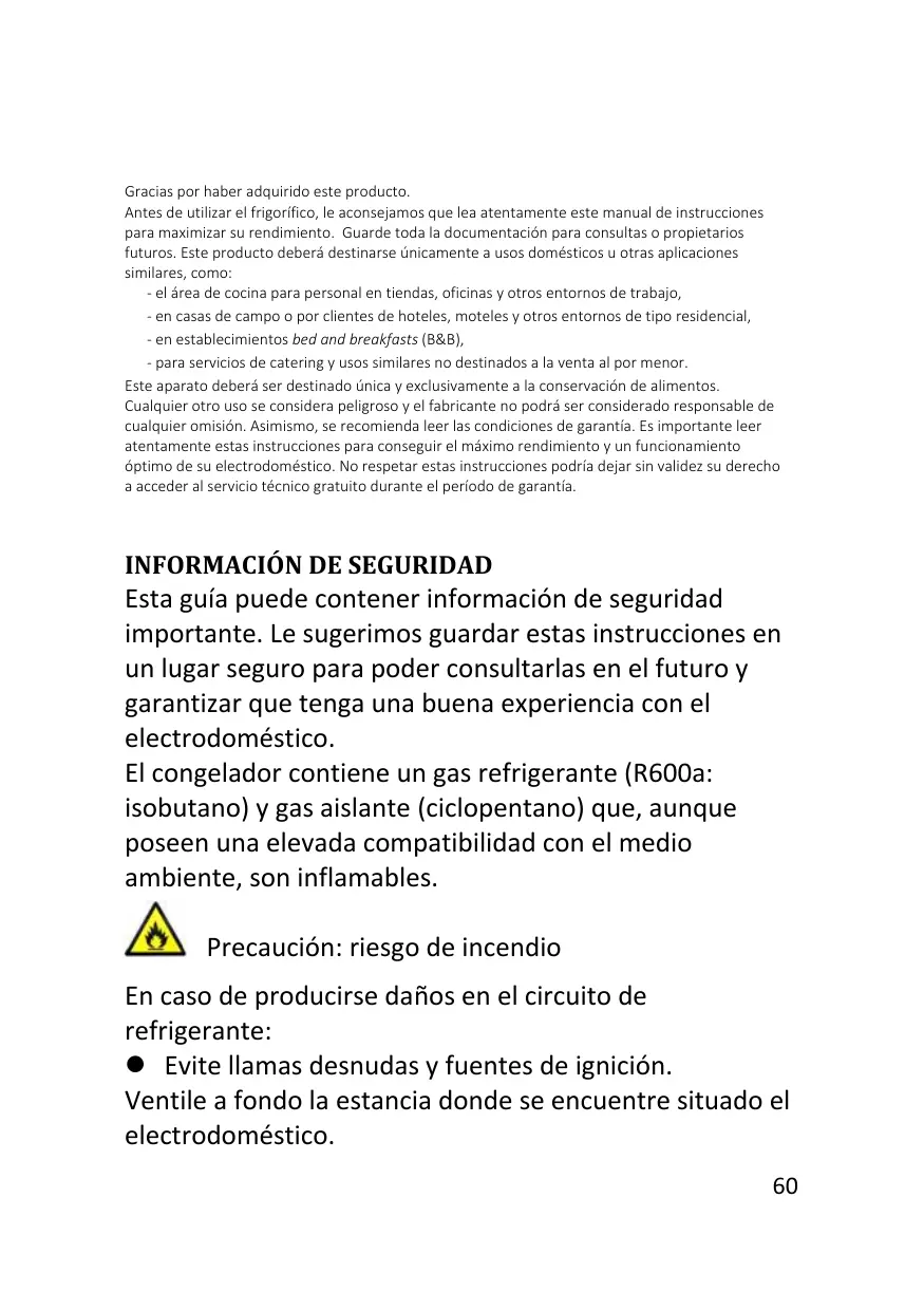 El congelador contiene un gas refrigerante (R600a: isobutano) y gas aislante (ciclopentano) que, aunque poseen una elevada compatibilidad con el medio ambiente, son inflamables. Precaución: riesgo de incendio En caso de producirse daños en el circuito de refrigerante: Evite llamas desnudas y fuentes de ignición. Ventile a fondo la estancia donde se encuentre situado el electrodoméstico. 60