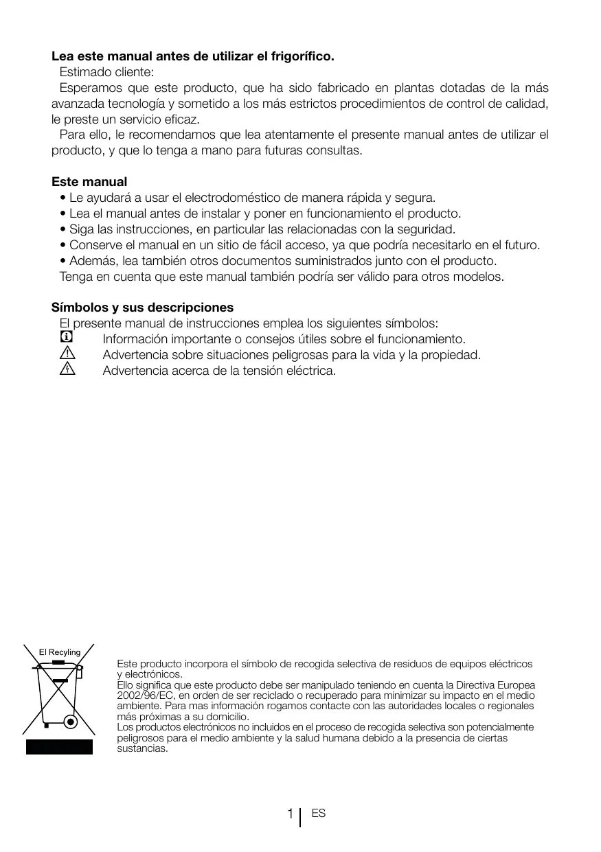 Lea este manual antes de utilizar el frigorífico. Estimado cliente: Esperamos que este producto, que ha sido fabricado en plantas dotadas de la más avanzada tecnología y sometido a los más estrictos procedimientos de control de calidad, le preste un servicio eficaz. Para ello, le recomendamos que lea atentamente el presente manual antes de utilizar el producto, y que lo tenga a mano para futuras consultas. Este manual • Le ayudará a usar el electrodoméstico de manera rápida y segura. • Lea el manual antes de instalar y poner en funcionamiento el producto. • Siga las instrucciones, en particular las relacionadas con la seguridad. • Conserve el manual en un sitio de fácil acceso, ya que podría necesitarlo en el futuro. • Además, lea también otros documentos suministrados junto con el producto. Tenga en cuenta que este manual también podría ser válido para otros modelos. Símbolos y sus descripciones El presente manual de instrucciones emplea los siguientes símbolos: C Información importante o consejos útiles sobre el funcionamiento. A Advertencia sobre situaciones peligrosas para la vida y la propiedad. B Advertencia acerca de la tensión eléctrica.