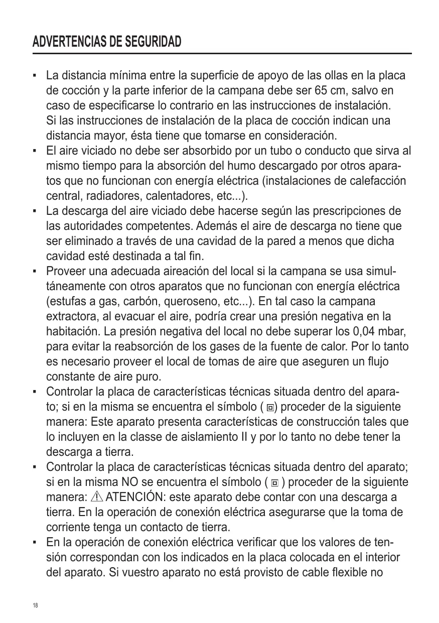 ▪ La distancia mínima entre la superficie de apoyo de las ollas en la placa de cocción y la parte inferior de la campana debe ser 65 cm, salvo en caso de especificarse lo contrario en las instrucciones de instalación. Si las instrucciones de instalación de la placa de cocción indican una distancia mayor, ésta tiene que tomarse en consideración. ▪ El aire viciado no debe ser absorbido por un tubo o conducto que sirva al mismo tiempo para la absorción del humo descargado por otros aparatos que no funcionan con energía eléctrica (instalaciones de calefacción central, radiadores, calentadores, etc...). ▪ La descarga del aire viciado debe hacerse según las prescripciones de las autoridades competentes. Además el aire de descarga no tiene que ser eliminado a través de una cavidad de la pared a menos que dicha cavidad esté destinada a tal fin. ▪ Proveer una adecuada aireación del local si la campana se usa simultáneamente con otros aparatos que no funcionan con energía eléctrica (estufas a gas, carbón, queroseno, etc...). En tal caso la campana extractora, al evacuar el aire, podría crear una presión negativa en la habitación. La presión negativa del local no debe superar los 0,04 mbar, para evitar la reabsorción de los gases de la fuente de calor. Por lo tanto es necesario proveer el local de tomas de aire que aseguren un flujo constante de aire puro. ▪ Controlar la placa de características técnicas situada dentro del aparato; si en la misma se encuentra el símbolo ( ) proceder de la siguiente manera: Este aparato presenta características de construcción tales que lo incluyen en la classe de aislamiento II y por lo tanto no debe tener la descarga a tierra. ▪ Controlar la placa de características técnicas situada dentro del aparato; si en la misma NO se encuentra el símbolo ( ) proceder de la siguiente manera: ATENCIÓN: este aparato debe contar con una descarga a tierra. En la operación de conexión eléctrica asegurarse que la toma de corriente tenga un contacto de tierra. ▪ En la operación de conexión eléctrica verificar que los valores de tensión correspondan con los indicados en la placa colocada en el interior del aparato. Si vuestro aparato no está provisto de cable flexible no 18
