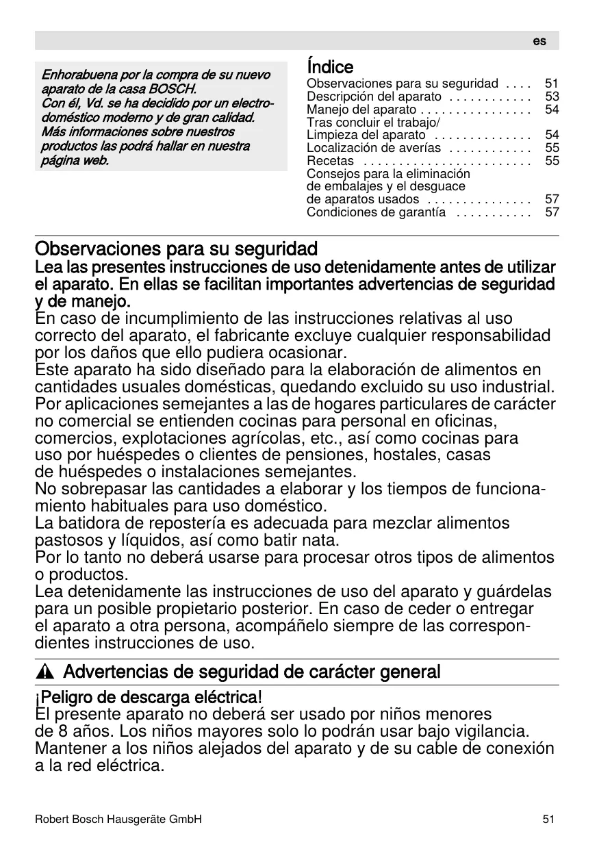 ъPeliбro de descarбa eléctrica! El presente aparato no deberá ser usado por niños зenores de 8 años. Los niños зaуores solo lo podrán usar baдo viбilancia. Зantener a los niños aleдados del aparato у de su cable de coneтión a la red eléctrica. Мobert Bosch Вausбeräte БзbВ