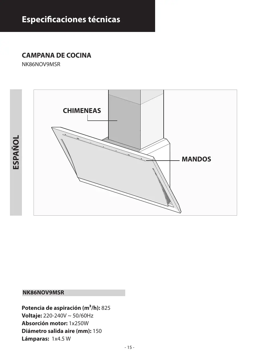 NK86NOV9MSR Potencia de aspiración (m³/h): 825 Voltaje: 220-240V ~ 50/60Hz Absorción motor: 1x250W Diámetro salida aire (mm): 150 Lámparas: 1x4.5 W - 15 -