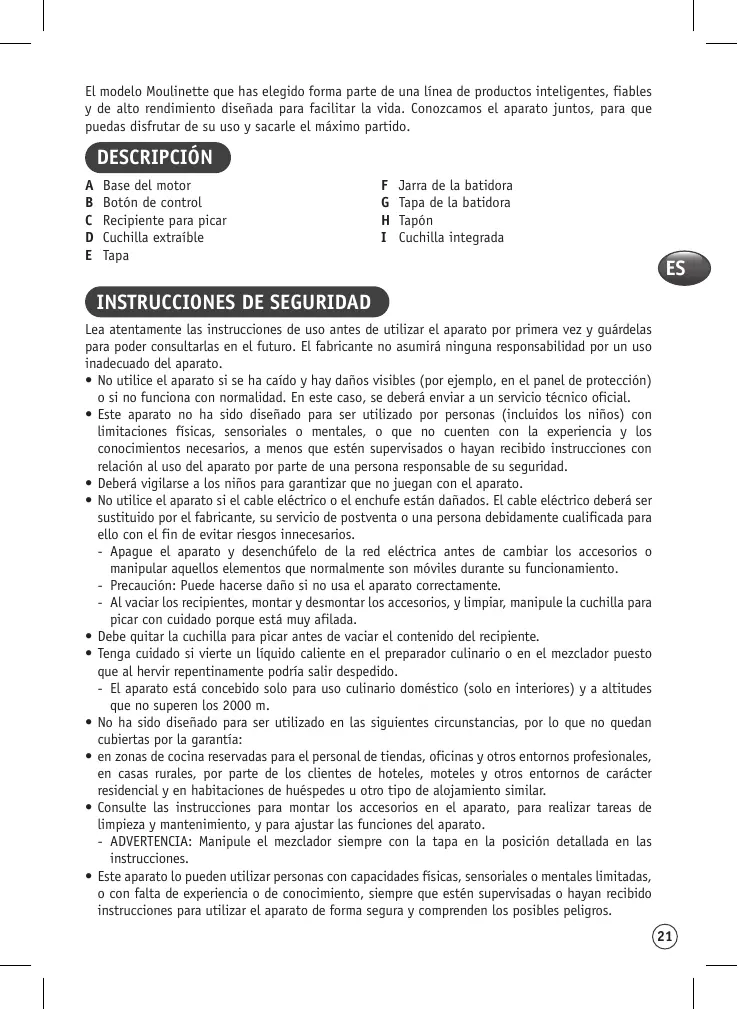 • No utilice el aparato si se ha caído y hay daños visibles (por ejemplo, en el panel de protección) o si no funciona con normalidad. En este caso, se deberá enviar a un servicio técnico oficial. • Este aparato no ha sido diseñado para ser utilizado por personas (incluidos los niños) con limitaciones físicas, sensoriales o mentales, o que no cuenten con la experiencia y los conocimientos necesarios, a menos que estén supervisados o hayan recibido instrucciones con relación al uso del aparato por parte de una persona responsable de su seguridad. • Deberá vigilarse a los niños para garantizar que no juegan con el aparato. • No utilice el aparato si el cable eléctrico o el enchufe están dañados. El cable eléctrico deberá ser sustituido por el fabricante, su servicio de postventa o una persona debidamente cualificada para ello con el fin de evitar riesgos innecesarios. - Apague el aparato y desenchúfelo de la red eléctrica antes de cambiar los accesorios o manipular aquellos elementos que normalmente son móviles durante su funcionamiento. - Precaución: Puede hacerse daño si no usa el aparato correctamente. - Al vaciar los recipientes, montar y desmontar los accesorios, y limpiar, manipule la cuchilla para picar con cuidado porque está muy afilada. • Debe quitar la cuchilla para picar antes de vaciar el contenido del recipiente. • Tenga cuidado si vierte un líquido caliente en el preparador culinario o en el mezclador puesto que al hervir repentinamente podría salir despedido. - El aparato está concebido solo para uso culinario doméstico (solo en interiores) y a altitudes que no superen los 2000 m. • No ha sido diseñado para ser utilizado en las siguientes circunstancias, por lo que no quedan cubiertas por la garantía: • en zonas de cocina reservadas para el personal de tiendas, oficinas y otros entornos profesionales, en casas rurales, por parte de los clientes de hoteles, moteles y otros entornos de carácter residencial y en habitaciones de huéspedes u otro tipo de alojamiento similar. • Consulte las instrucciones para montar los accesorios en el aparato, para realizar tareas de limpieza y mantenimiento, y para ajustar las funciones del aparato. - ADVERTENCIA: Manipule el mezclador siempre con la tapa en la posición detallada en las instrucciones. • Este aparato lo pueden utilizar personas con capacidades físicas, sensoriales o mentales limitadas, o con falta de experiencia o de conocimiento, siempre que estén supervisadas o hayan recibido instrucciones para utilizar el aparato de forma segura y comprenden los posibles peligros. 21