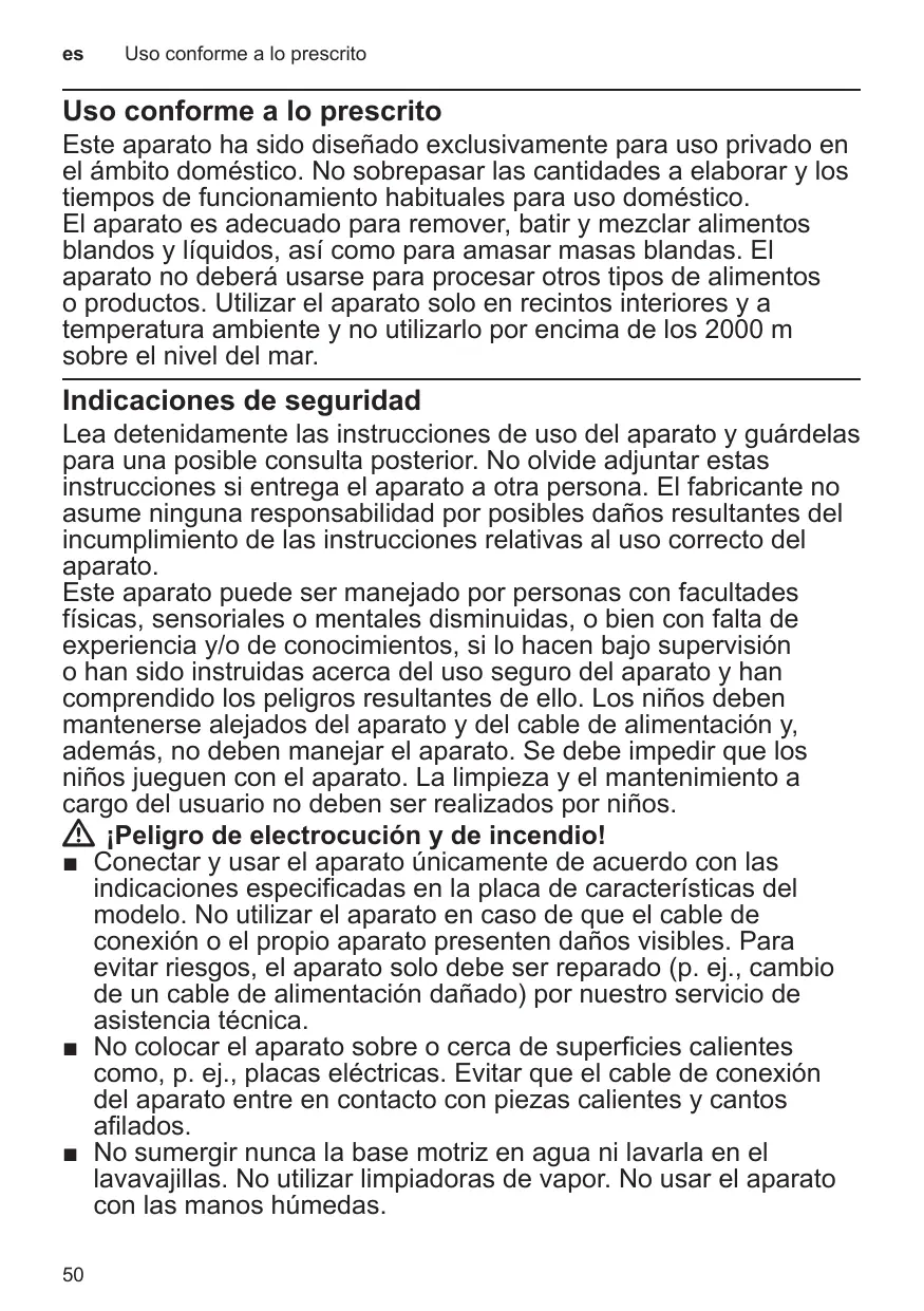 Este aparato ha sido diseñado exclusivamente para uso privado en el ámbito doméstico. No sobrepasar las cantidades a elaborar y los tiempos de funcionamiento habituales para uso doméstico. El aparato es adecuado para remover, batir y mezclar alimentos blandos y líquidos, así como para amasar masas blandas. El aparato no deberá usarse para procesar otros tipos de alimentos o productos. Utilizar el aparato solo en recintos interiores y a temperatura ambiente y no utilizarlo por encima de los 2000 m sobre el nivel del mar.