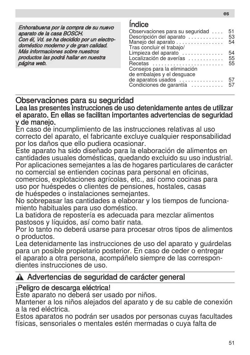 ¡Peligro de descarga eléctrica! Este aparato no deberá ser usado por niños. Mantener a los niños alejados del aparato y de su cable de conexión a la red eléctrica. Estos aparatos no podrán ser usados por personas cuyas facultades físicas, sensoriales o mentales estén mermadas o cuya falta de Robert Bosch Hausgeräte GmbH