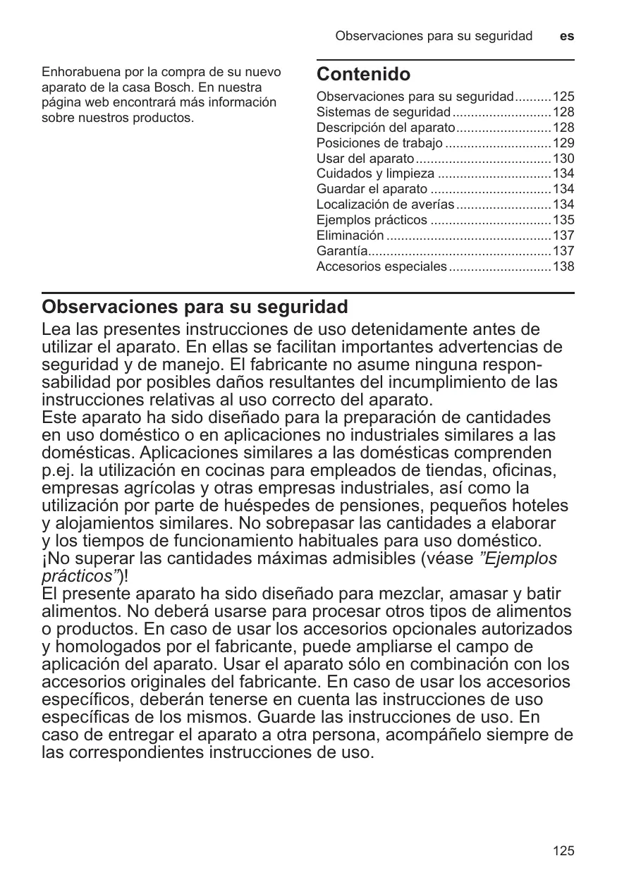 Este aparato ha sido diseñado para la preparación de cantidades en uso doméstico o en aplicaciones no industriales similares a las domésticas. Aplicaciones similares a las domésticas comprenden p.ej. la utilización en cocinas para empleados de tiendas, oficinas, empresas agrícolas y otras empresas industriales, así como la utilización por parte de huéspedes de pensiones, pequeños hoteles y alojamientos similares. No sobrepasar las cantidades a elaborar y los tiempos de funcionamiento habituales para uso doméstico. ¡No superar las cantidades máximas admisibles (véase ”Ejemplos prácticos”)! El presente aparato ha sido diseñado para mezclar, amasar y batir alimentos. No deberá usarse para procesar otros tipos de alimentos o productos. En caso de usar los accesorios opcionales autorizados y homologados por el fabricante, puede ampliarse el campo de aplicación del aparato. Usar el aparato sólo en combinación con los accesorios originales del fabricante. En caso de usar los accesorios específicos, deberán tenerse en cuenta las instrucciones de uso específicas de los mismos. Guarde las instrucciones de uso. En caso de entregar el aparato a otra persona, acompáñelo siempre de las correspondientes instrucciones de uso.
