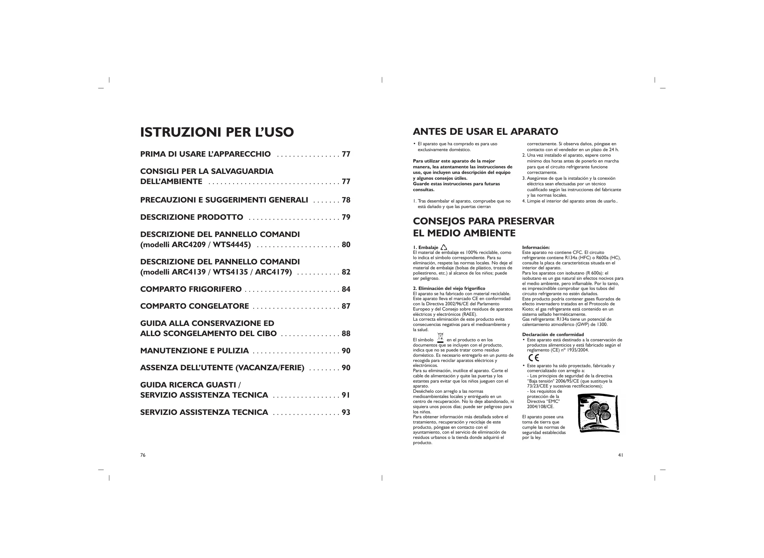 DESCRIPCIÓN DEL PANEL DE MANDOS (modelos ARC4209 / WTS4445) . . . . . . . . . . . . . . . . . . . . 44 DESCRIPCIÓN DEL PANEL DE MANDOS (Modelos ARC4139 / WTS4135 / ARC4179) . . . . . . . . . . 46 COMPARTIMENTO FRIGORÍFICO . . . . . . . . . . . . . . . . . . 48 COMPARTIMENTO CONGELADOR . . . . . . . . . . . . . . . . 51 GUÍA PARA LA CONSERVACIÓN Y LA DESCONGELACIÓN DE LOS ALIMENTOS . . . . . . . 52 MANTENIMIENTO Y LIMPIEZA . . . . . . . . . . . . . . . . . . . . 54 AUSENCIA DEL USUARIO (VACACIONES LARGAS/CORTAS) . . . . . . . . . . . . . . . . 54 GUÍA DE SOLUCIÓN DE PROBLEMAS / SERVICIO DE ASISTENCIA TÉCNICA . . . . . . . . . . . . . . 55 SERVICIO DE ASISTENCIA TÉCNICA . . . . . . . . . . . . . . 57