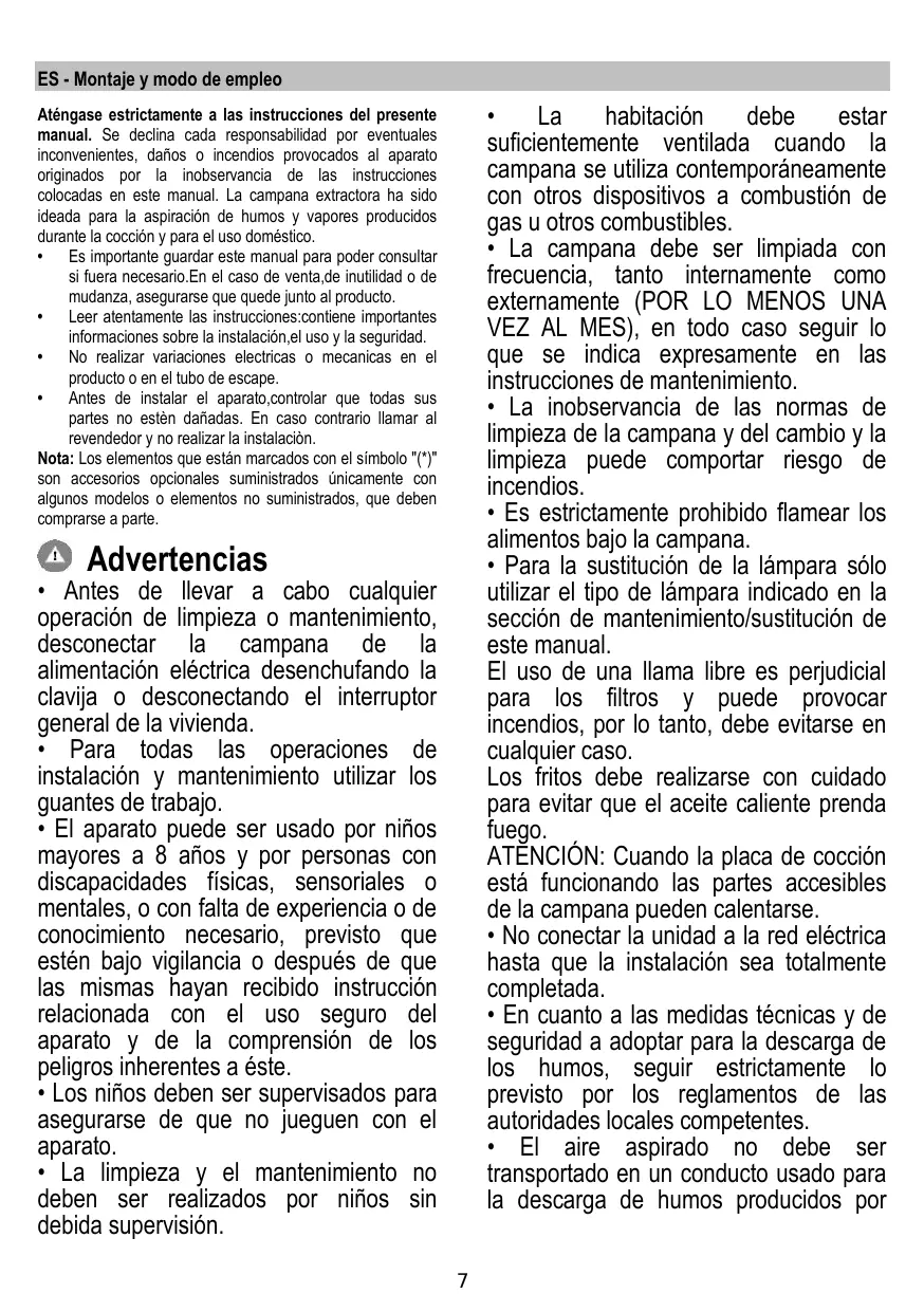 Aténgase estrictamente a las instrucciones del presente manual. Se declina cada responsabilidad por eventuales inconvenientes, daños o incendios provocados al aparato originados por la inobservancia de las instrucciones colocadas en este manual. La campana extractora ha sido ideada para la aspiración de humos y vapores producidos durante la cocción y para el uso doméstico.