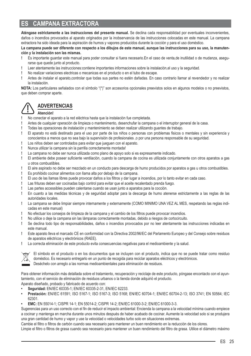 No conectar el aparato a la red eléctrica hasta que la instalación fue completada. Antes de cualquier operación de limpieza o mantenimento, desenchufar la campana o el interruptor general de la casa. Todas las operaciones de instalación y mantenimiento se deben realizar utilizando guantes de trabajo. El aparato no está destinado para el uso por parte de los niños o personas con problemas fisicos o mentales y sin experiencia y conocientos a menos que no sea bajo la supervisión de profesionales ,o por una persona responsable de su seguridad. Los niños deben ser controlados para evitar que jueguen con el aparato. Nunca utilizar la campana sin la parrilla correctamente montada! La campana no debe ser nunca utilizada como plano de apoyo solo si es expresamente indicado. El ambiente debe poseer suficiente ventilación, cuando la campana de cocina es utilizada conjuntamente con otros aparatos a gas u otros combustibles. El aire aspirado no debe ser mezclado en un conducto para descarga de humo producidos por aparatos a gas u otros combustibles. Es prohibido cocinar alimentos con llama alta por debajo de la campana. El uso de las llamas libres puede provocar daños a los filtros y dar lugar a incendios, por lo tanto evitar en cada caso. Las frituras deben ser cocinadas bajo control para evitar que el aceite recalentado prenda fuego. Las partes accessibles pueden calentarse cuando se usan junto a aparatos para la cocción. En cuanto a las medidas técnicas y de seguridad adoptar para la descarga de humo atenerse estrictamente a las reglas de las autoridades locales. La campana se debe limpiar siempre internamente y externamente (COMO MINIMO UNA VEZ AL MES, respetando las reglas indicadas en este manual) No efectuar los consejos de limpieza de la campana y el cambio de los filtros puede provocar incendios. No utilice o deje la campana sin las lámparas correctamente montadas, debido a riesgos de cortocircuito. Se declina todo tipo de responsabilidades, daños o incendios provocados por no leer atentamente las instrucciones indicadas en este manual. Este aparato lleva el marcado CE en conformidad con la Directiva 2002/96/EC del Parlamento Europeo y del Consejo sobre residuos de aparatos eléctricos y electrónicos (RAEE). La correcta eliminación de este producto evita consecuencias negativas para el medioambiente y la salud. El símbolo en el producto o en los documentos que se incluyen con el producto, indica que no se puede tratar como residuo doméstico. Es necesario entregarlo en un punto de recogida para reciclar aparatos eléctricos y electrónicos. Deséchelo con arreglo a las normas medioambientales para eliminación de residuos.