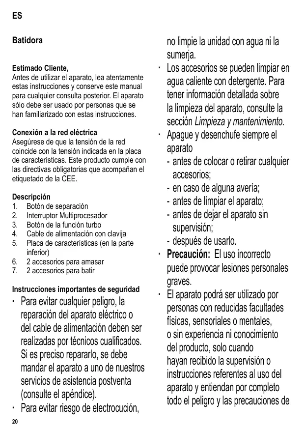 1. Botón de separación 2. Interruptor Multiprocesador 3. Botón de la función turbo 4. Cable de alimentación con clavija 5. Placa de características (en la parte inferior) 6. 2 accesorios para amasar 7. 2 accesorios para batir Instrucciones importantes de seguridad