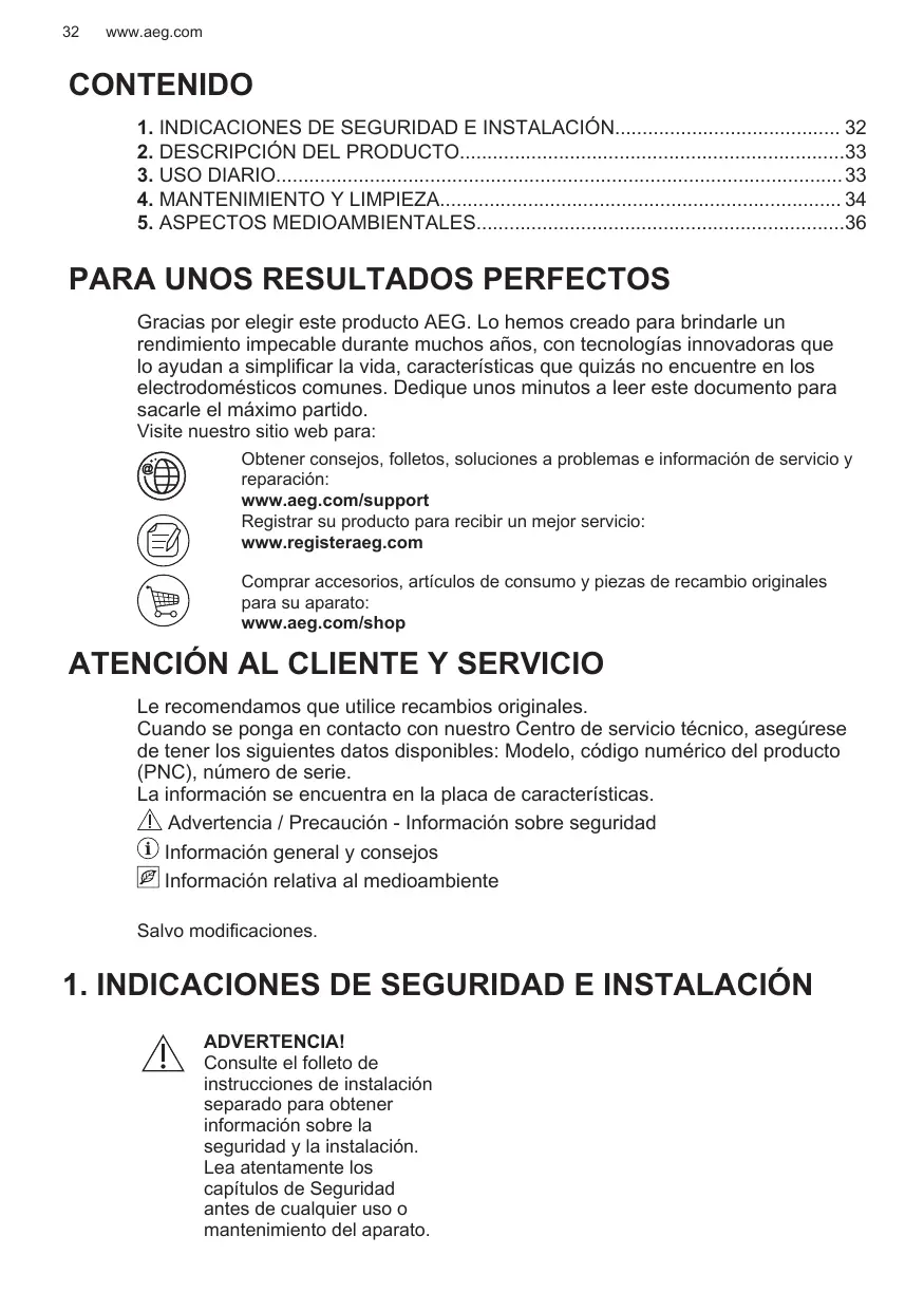 Registrar su producto para recibir un mejor servicio: www.registeraeg.com Comprar accesorios, artículos de consumo y piezas de recambio originales para su aparato: www.aeg.com/shop