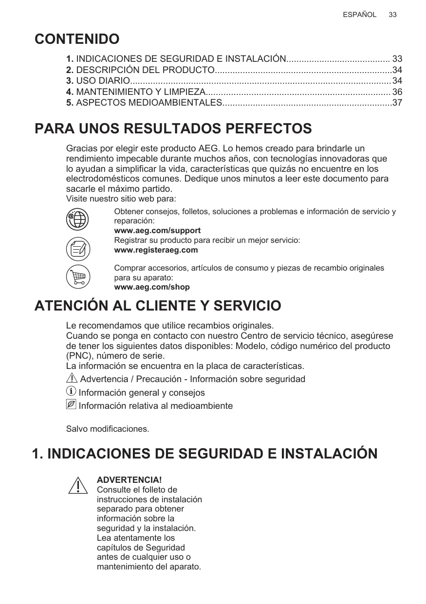 Registrar su producto para recibir un mejor servicio: www.registeraeg.com Comprar accesorios, artículos de consumo y piezas de recambio originales para su aparato: www.aeg.com/shop