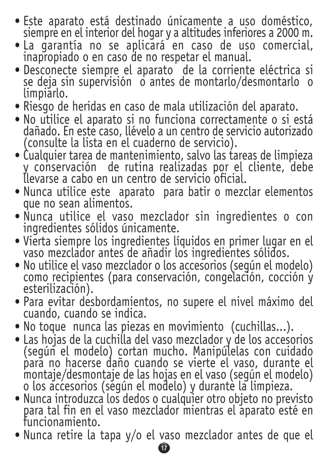 • R iesgo de heridas en caso de mala utilización del aparato. •N o utilice el aparato si no funciona correctamente o si está dañado. En este caso, llévelo a un centro de servicio autorizado (consulte la lista en el cuaderno de servicio). • C ualquier tarea de mantenimiento, salvo las tareas de limpieza y conservación de rutina realizadas por el cliente, debe llevarse a cabo en un centro de servicio oficial. •N unca utilice este aparato para batir o mezclar elementos que no sean alimentos. •N unca utilice el vaso mezclador sin ingredientes o con ingredientes sólidos únicamente. • V ierta siempre los ingredientes líquidos en primer lugar en el vaso mezclador antes de añadir los ingredientes sólidos. • No utilice el vaso mezclador o los accesorios (según el modelo) como recipientes (para conservación, congelación, cocción y esterilización). • P ara evitar desbordamientos, no supere el nivel máximo del cuando, cuando se indica. •N o toque nunca las piezas en movimiento (cuchillas...). • L as hojas de la cuchilla del vaso mezclador y de los accesorios (según el modelo) cortan mucho. Manipúlelas con cuidado para no hacerse daño cuando se vierte el vaso, durante el montaje/desmontaje de las hojas en el vaso (según el modelo) o los accesorios (según el modelo) y durante la limpieza. •N unca introduzca los dedos o cualquier otro objeto no previsto para tal fin en el vaso mezclador mientras el aparato esté en funcionamiento. •N unca retire la tapa y/o el vaso mezclador antes de que el 17
