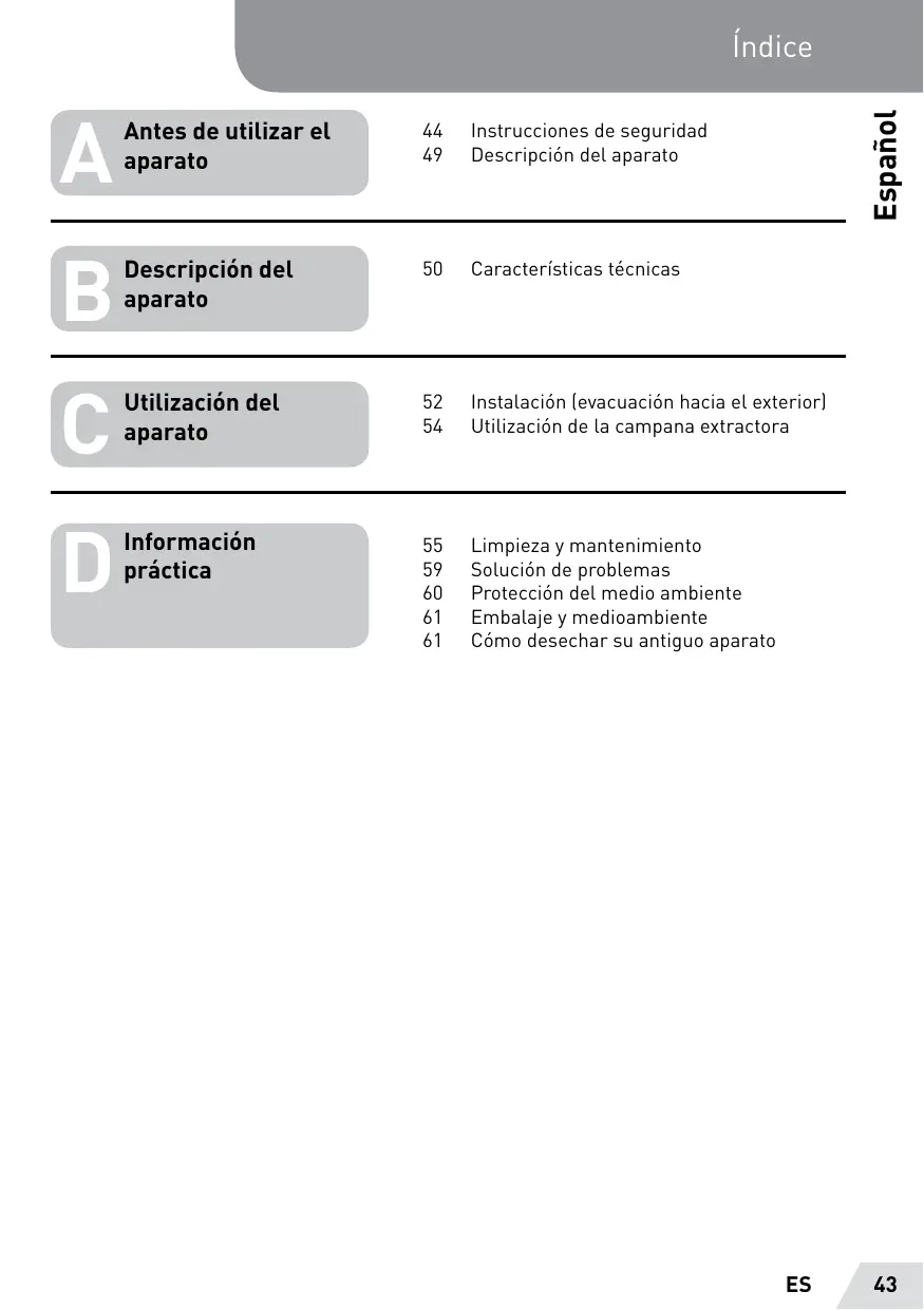 A d v e r t e n c i a s suplementarias de seguridad • Este aparato está destinado únicamente a aspirar aire viciado sobre una placa de cocción en un contexto doméstico y, bajo ninguna circunstancia, para un uso dentro de un entorno comercial o industrial.