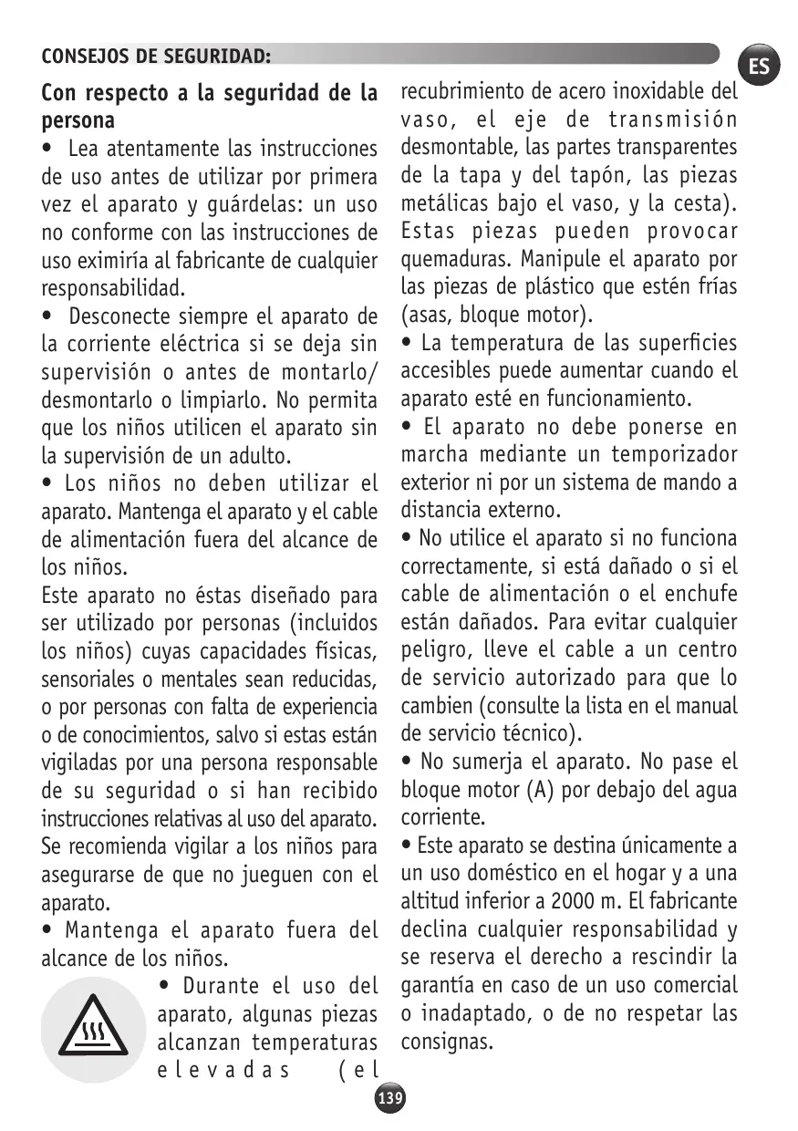 • Lea atentamente las instrucciones de uso antes de utilizar por primera vez el aparato y guárdelas: un uso no conforme con las instrucciones de uso eximiría al fabricante de cualquier responsabilidad. • Desconecte siempre el aparato de la corriente eléctrica si se deja sin supervisión o antes de montarlo/ desmontarlo o limpiarlo. No permita que los niños utilicen el aparato sin la supervisión de un adulto. • Los niños no deben utilizar el aparato. Mantenga el aparato y el cable de alimentación fuera del alcance de los niños. Este aparato no éstas diseñado para ser utilizado por personas (incluidos los niños) cuyas capacidades físicas, sensoriales o mentales sean reducidas, o por personas con falta de experiencia o de conocimientos, salvo si estas están vigiladas por una persona responsable de su seguridad o si han recibido instrucciones relativas al uso del aparato. Se recomienda vigilar a los niños para asegurarse de que no jueguen con el aparato. • Mantenga el aparato fuera del alcance de los niños. • Durante el uso del aparato, algunas piezas alcanzan temperaturas elevadas (el