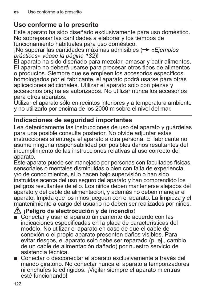 Este aparato ha sido diseñado exclusivamente para uso doméstico. No sobrepasar las cantidades a elaborar y los tiempos de funcionamiento habituales para uso doméstico. ¡No superar las cantidades máximas admisibles (X «Ejemplos prácticos» véase la página 132)! El aparato ha sido diseñado para mezclar, amasar y batir alimentos. El aparato no deberá usarse para procesar otros tipos de alimentos o productos. Siempre que se empleen los accesorios específicos homologados por el fabricante, el aparato podrá usarse para otras aplicaciones adicionales. Utilizar el aparato solo con piezas y accesorios originales autorizados. No utilizar nunca los accesorios para otros aparatos. Utilizar el aparato sólo en recintos interiores y a temperatura ambiente y no utilizarlo por encima de los 2000 m sobre el nivel del mar.